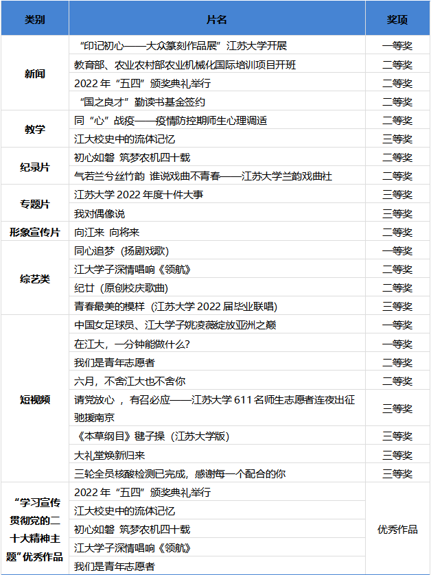 近年来,党委宣传部坚持围绕中心、服务大局,注重创新理念、主动作为,积极推动融媒体建设,努力讲好江大故事,传播江大好声音,不断提升视频传播的权威性和影响力。此次获奖作品分属新闻类、教学类、综艺类、纪录片、专题片、形象宣传片、短视频 7个类别,涵盖了理想信念、文化传承、校友情怀、疫情防控等主题,反映了学校鲜明的学科特色与文化情怀。(党委宣传部)