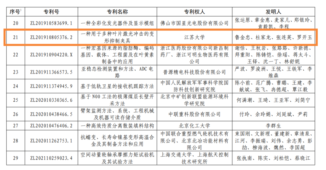 学校此次获得金奖的专利是由鲁金忠教授团队完成,其适用于多种具有不同叶根形式及安装角的叶片零件装夹定位,在提供可靠定位、保证装夹效率的同时提高夹具适用性,提高激光冲击强化精度以及冲击效率,提高了高端激光加工装备的科技水平,在航天设备制造、航空发动机、汽轮动力等领域广泛实施,取得了显著的经济效益,对行业发展具有较大的影响力。