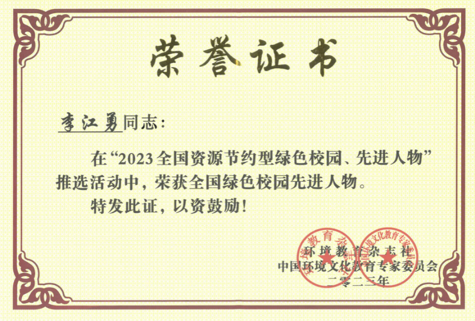 近日,在由中国环境文化教育专家委员会、生态环境部主管的《环境教育》杂志社共同开展的“2023全国资源节约型绿色校园、先进人物”推选活动中,beat365官网被评为“全国资源节约型绿色校园”,后勤处(集团)李江勇同志被评为“全国绿色校园先进人物”。