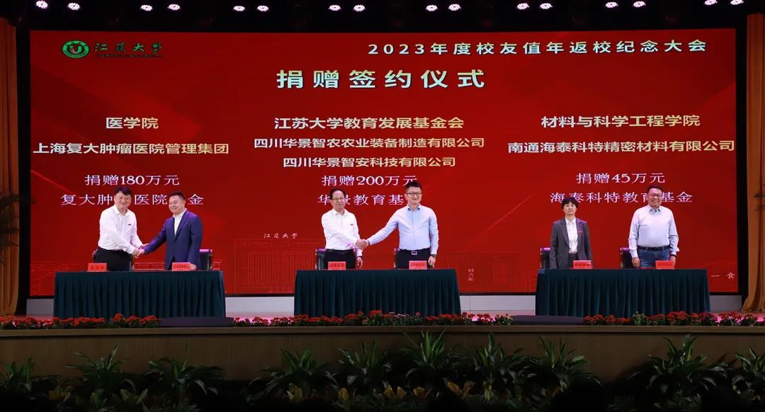 会上举行了校友和爱心企业向学校捐赠签约仪式。校友陈俊年创立的四川华景智农农业装备有限公司、四川华景智安科技有限公司两家企业共捐赠200万元在beat365中文官方网站设立“华景教育基金”,上海复大肿瘤医院管理集团向beat365中文官方网站医学院捐赠180万元设立医学发展基金——“复大肿瘤医院基金”,南通海泰科特精密材料有限公司向beat365中文官方网站材料科学与工程学院捐赠45万元设立“海泰科特教育基金”。