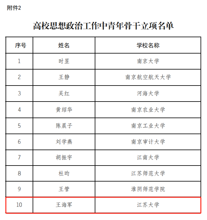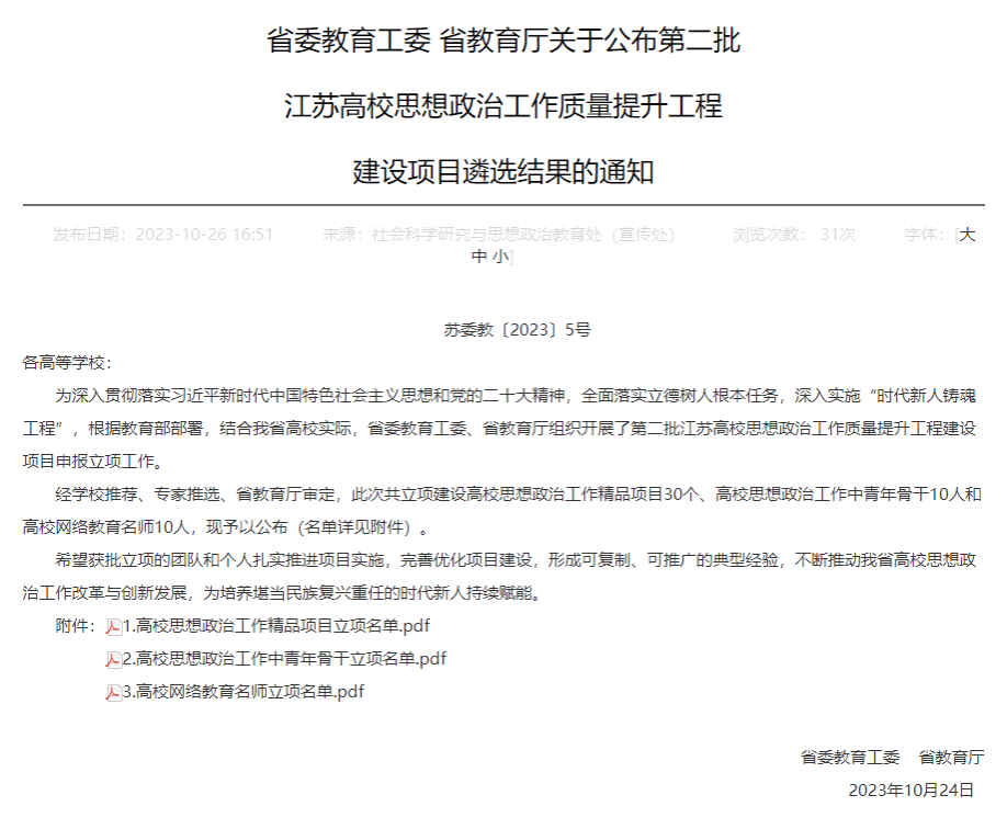 近日,省委教育工委、省教育厅公布了第二批江苏高校思想政治工作质量提升工程建设项目遴选结果,beat365官网1人获高校思想政治工作中青年骨干建设项目立项,并推荐至教育部参评该类项目,1人获高校网络教育名师立项。此外,beat365官网申报的1项学生心理健康教育指导典型案例项目被推荐至教育部参评该类项目。