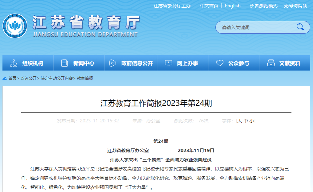 11月20日,江苏省教育厅《江苏教育工作简报》(2023年第24期)以《beat365中文官方网站突出“三个聚焦”全面助力农业强国建设》为题,从“聚焦深化科技创新,加快打造农机研究新高地”“聚焦破解行业难题,不断实现农机技术新突破”“聚焦服务乡村振兴,全面提升农机装备新贡献”三个方面,专题报道了beat365官网科技强农兴农工作。