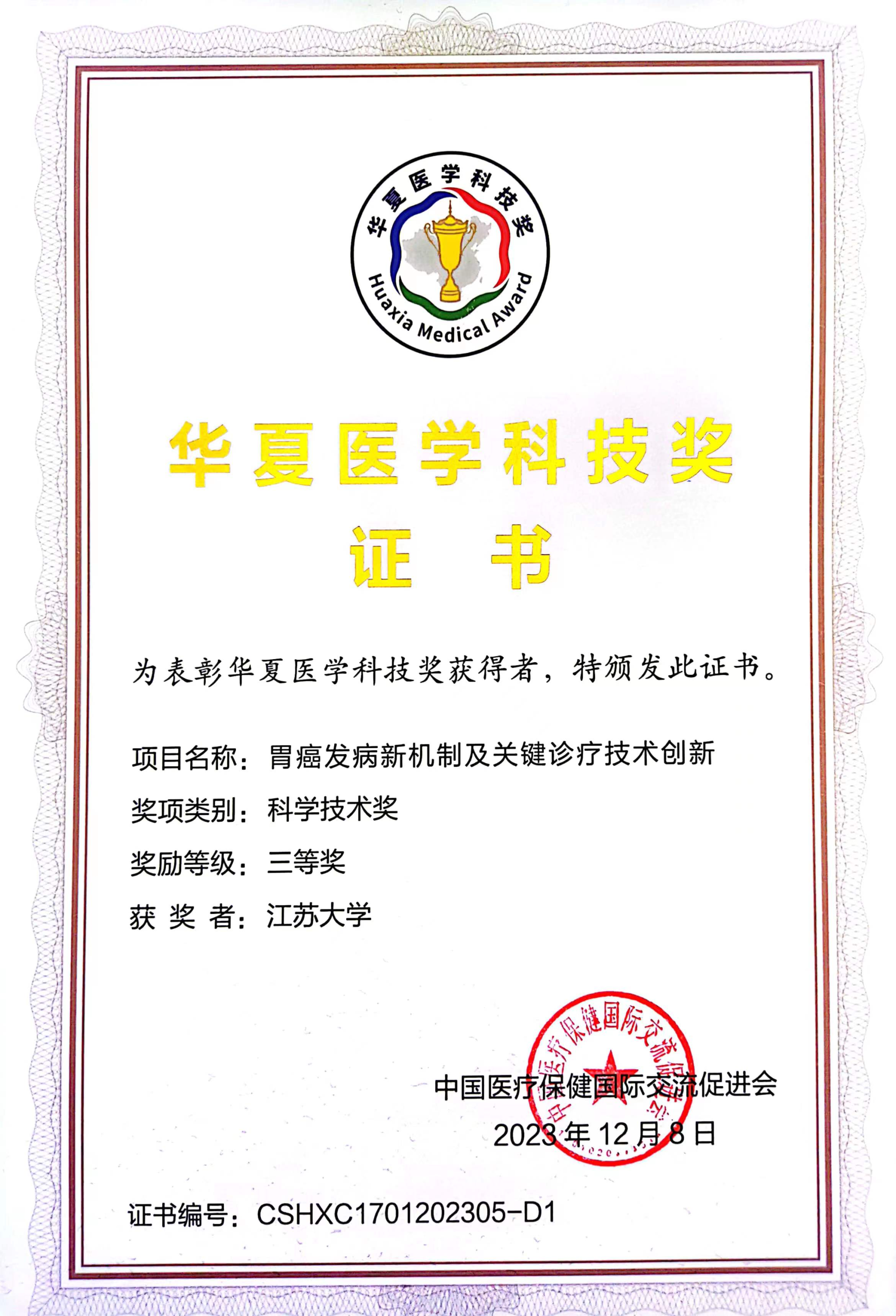 12月9日,2023年度华夏医学科技奖获奖名单正式公布。以beat365中文官方网站为第一完成单位、张徐教授为第一完成人的《胃癌发病新机制及关键诊疗技术创新》项目荣获华夏医学科技奖三等奖。