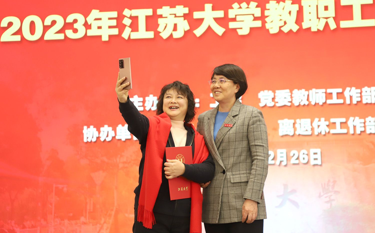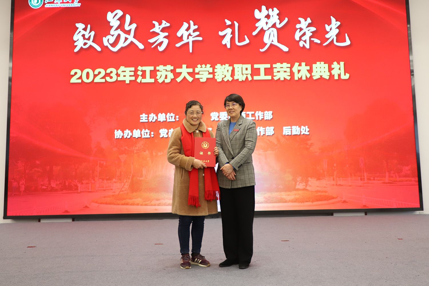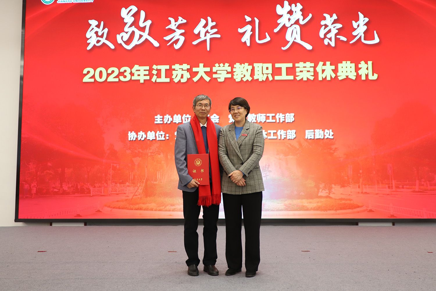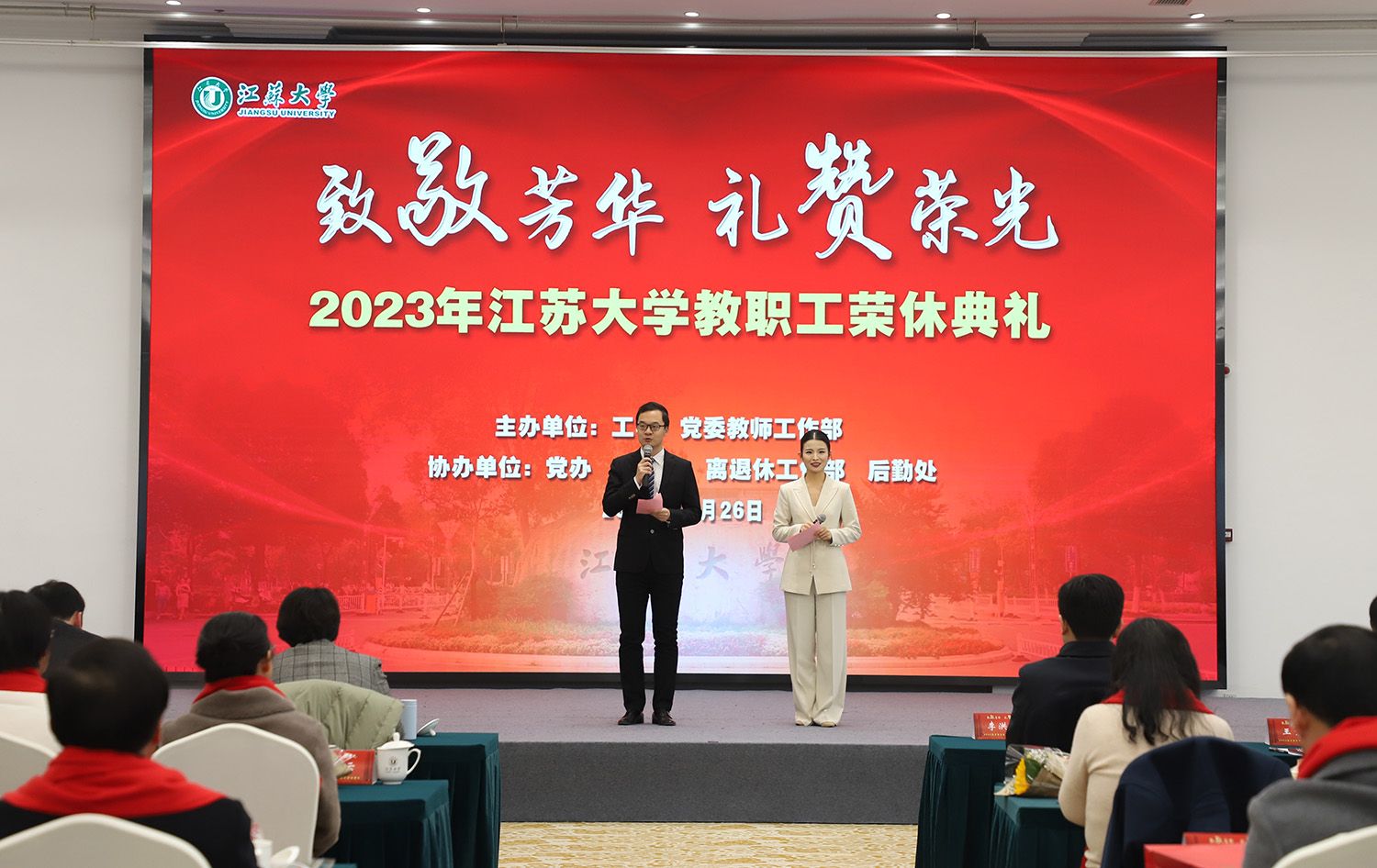 校党委书记李洪波,校长邢卫红,副校长王景全、任旭东,校党委常委、宣传部部长、统战部部长吴麟麟,相关职能部门领导,荣休教职工代表及原所在单位领导、工会主席、师生代表等参加典礼。