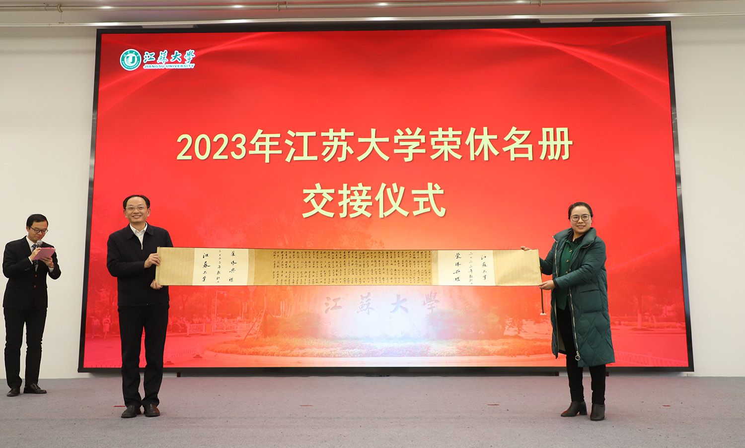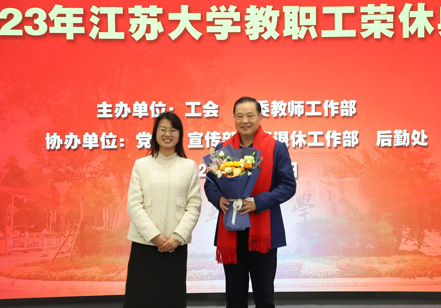 典礼上,校工会常务副主席王善民向党委离退休工作部部长林新荣递交2023年退休教职工名册。