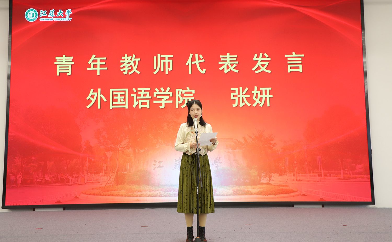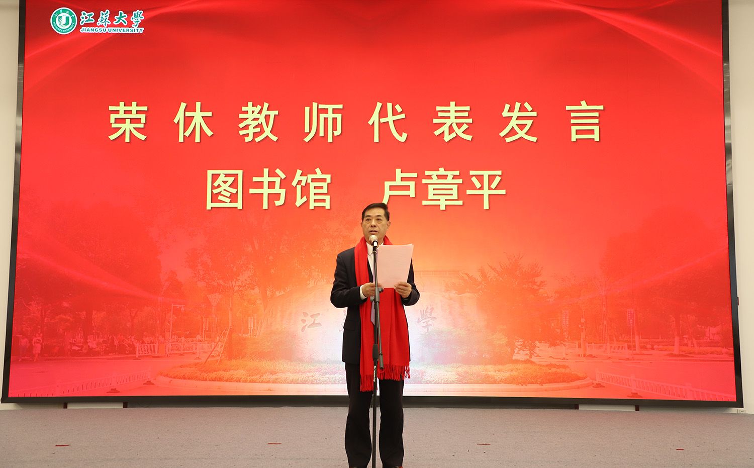 荣休教师代表、图书馆原馆长卢章平,青年教师代表、外国语学院张妍分别在典礼上发言。