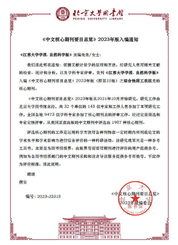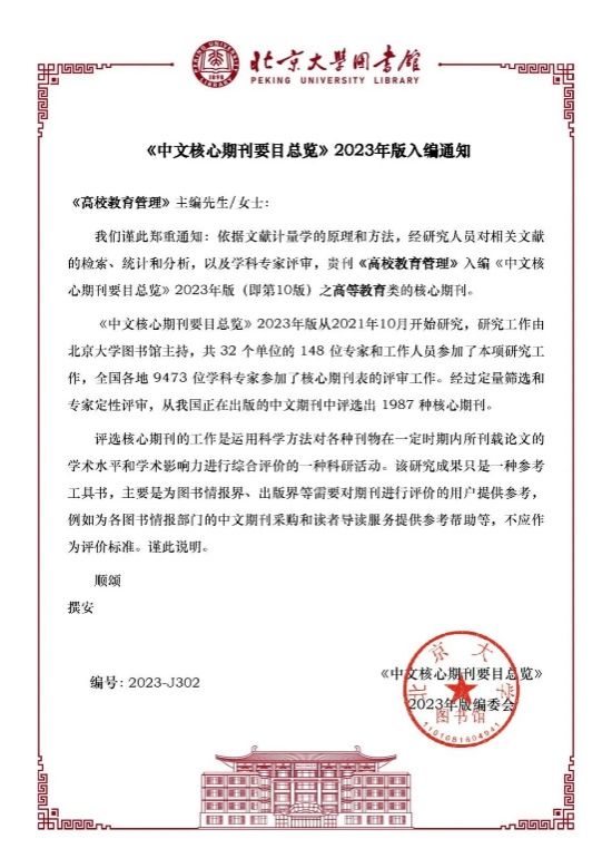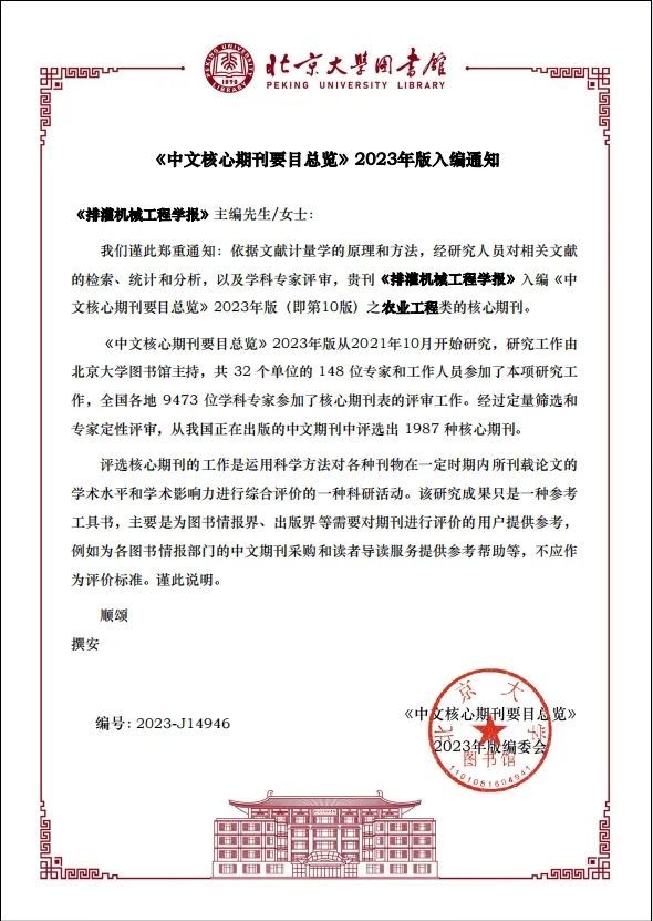 近日,在北京大学图书馆《中文核心期刊要目总览》2023年版(第10版)遴选中,beat365官网主办的《beat365中文官方网站学报(自然科学版)》第8次入选,入编综合性理工农医类核心期刊;《排灌机械工程学报》第7次入选,入编农业工程类核心期刊;《高校教育管理》第4次入选,入编高等教育类核心期刊。