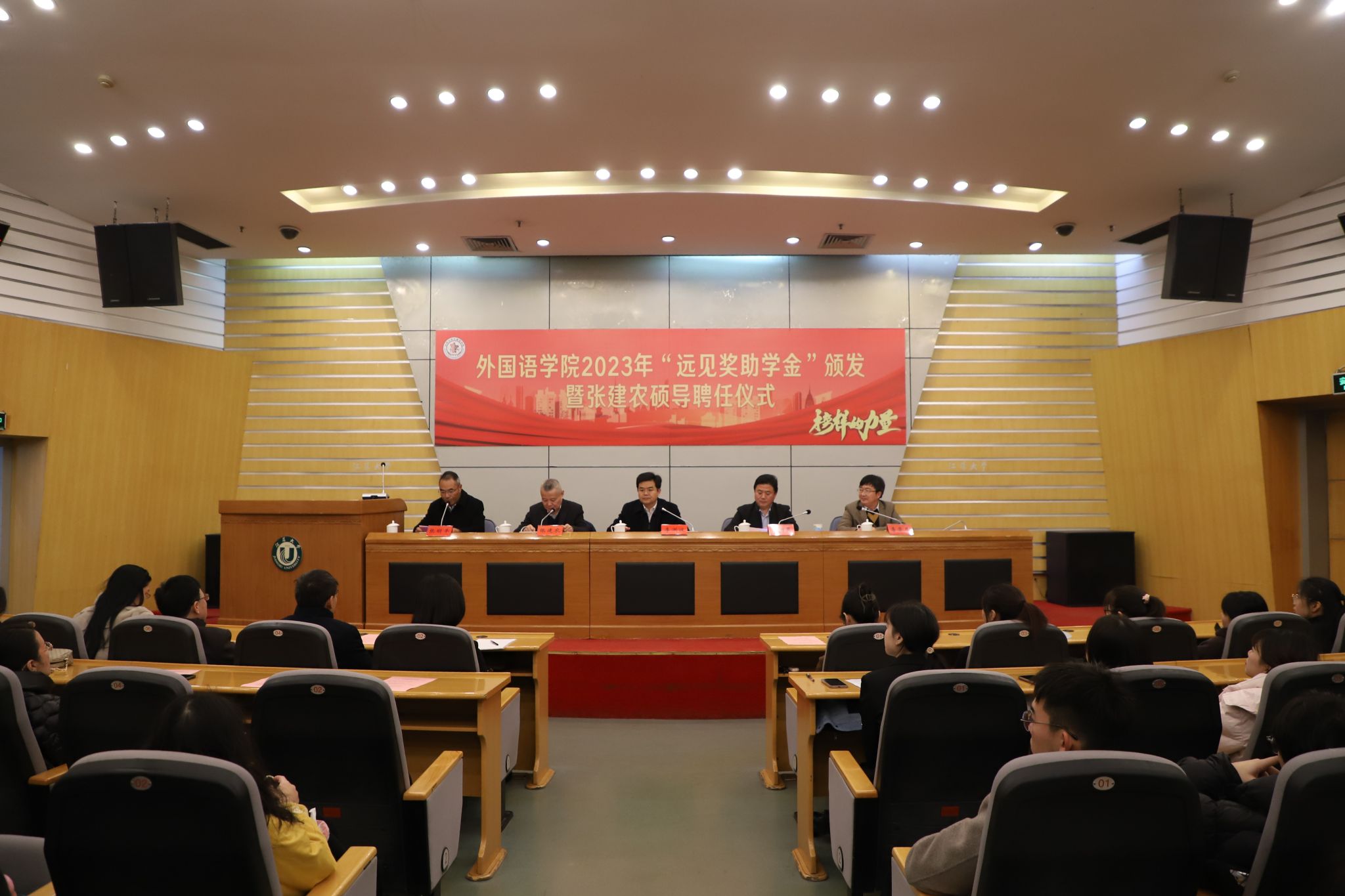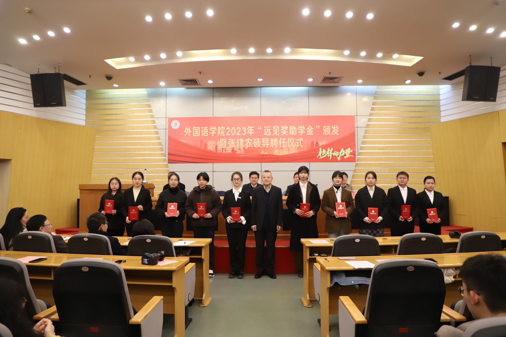 1月3日,外国语学院在会议中心第一报告厅举行2023年度“远见奖助学金”颁发暨张建农硕导聘任仪式。校党委书记李洪波,“远见奖助学金”设立者张建农,校友会与对外联络办公室主任李国昊,外国语学院领导班子及师生代表200余人参加活动。活动由外国语学院党委书记张明平主持。