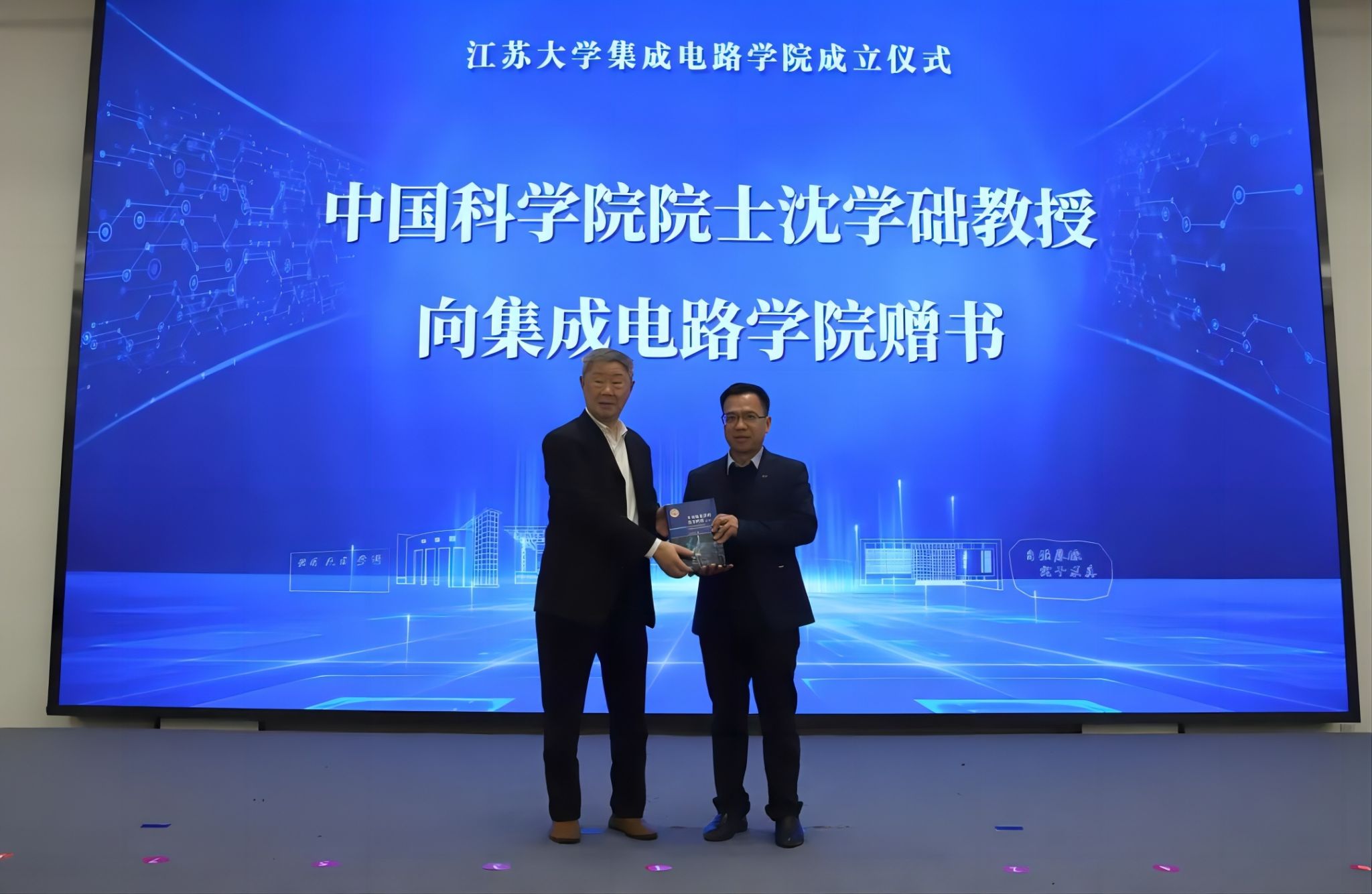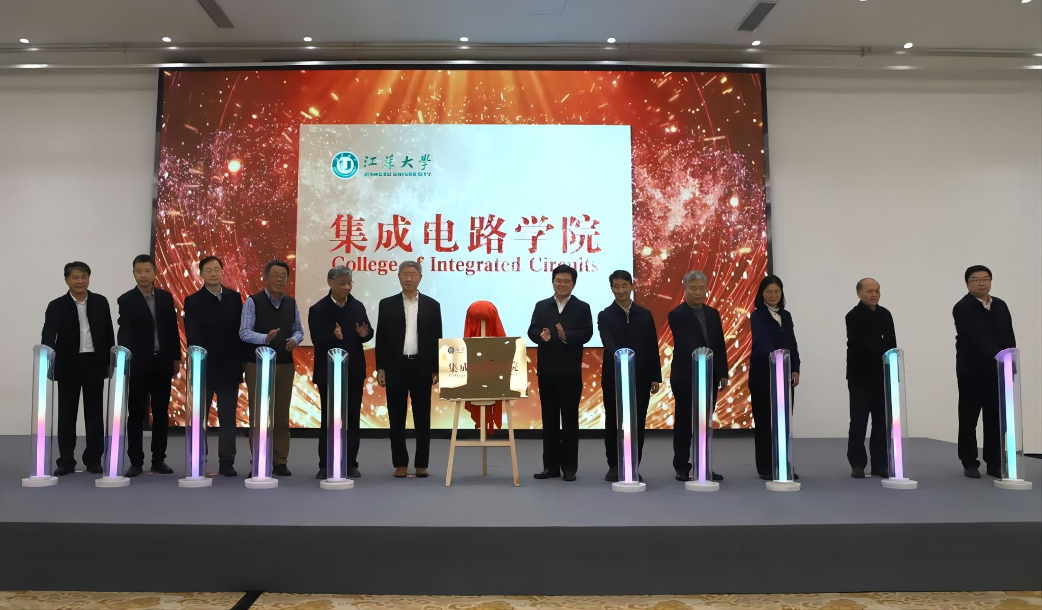 沈学础、祝世宁、郭万林、时龙兴、郭宇锋、池宇、曹丽虹、程宇、颜晓红、顾小俊、南京信息职业技术学院校长田敏、校党委书记李洪波共同为beat365中文官方网站集成电路学院揭牌。