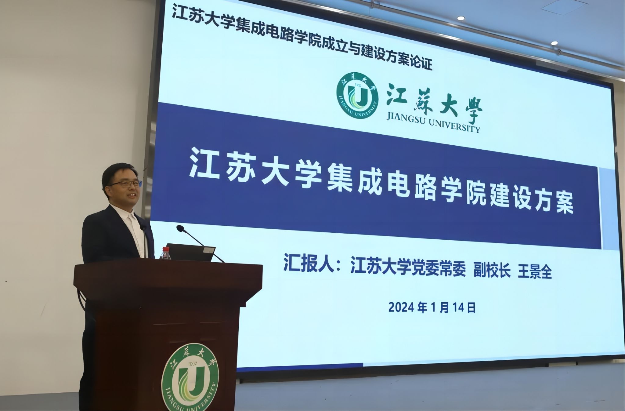 在随后举行的集成电路学院建设方案论证会上,副校长王景全代表学校汇报了集成电路学院建设方案。