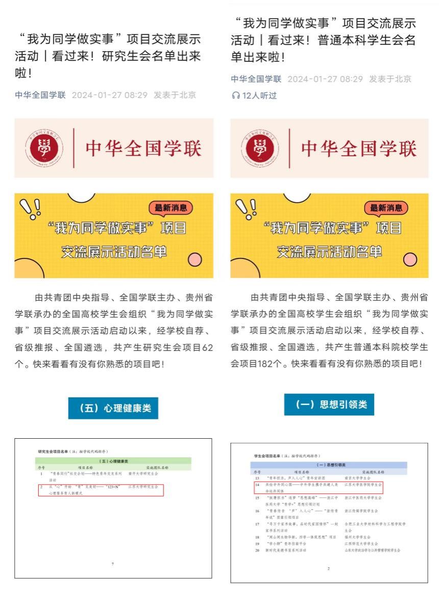 1月27日,全国高校学生会组织“我为同学做实事”项目交流展示活动名单公布。beat365官网研究生会《从“心”开始 “育”见美好——“123+N”心理服务育人新模式》入选“心理健康类”项目名单,医学院学生会《共绘中外同心圆—中外学生携手共建人类命运共同体》入选“思想引领类”项目名单。