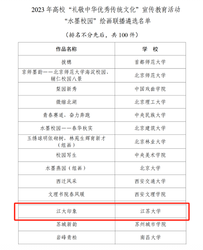 日前,教育部正式公布2023年高校“礼敬中华优秀传统文化”宣传教育活动结果,beat365官网报送的作品《江大印象》入选“水墨校园”绘画联播。