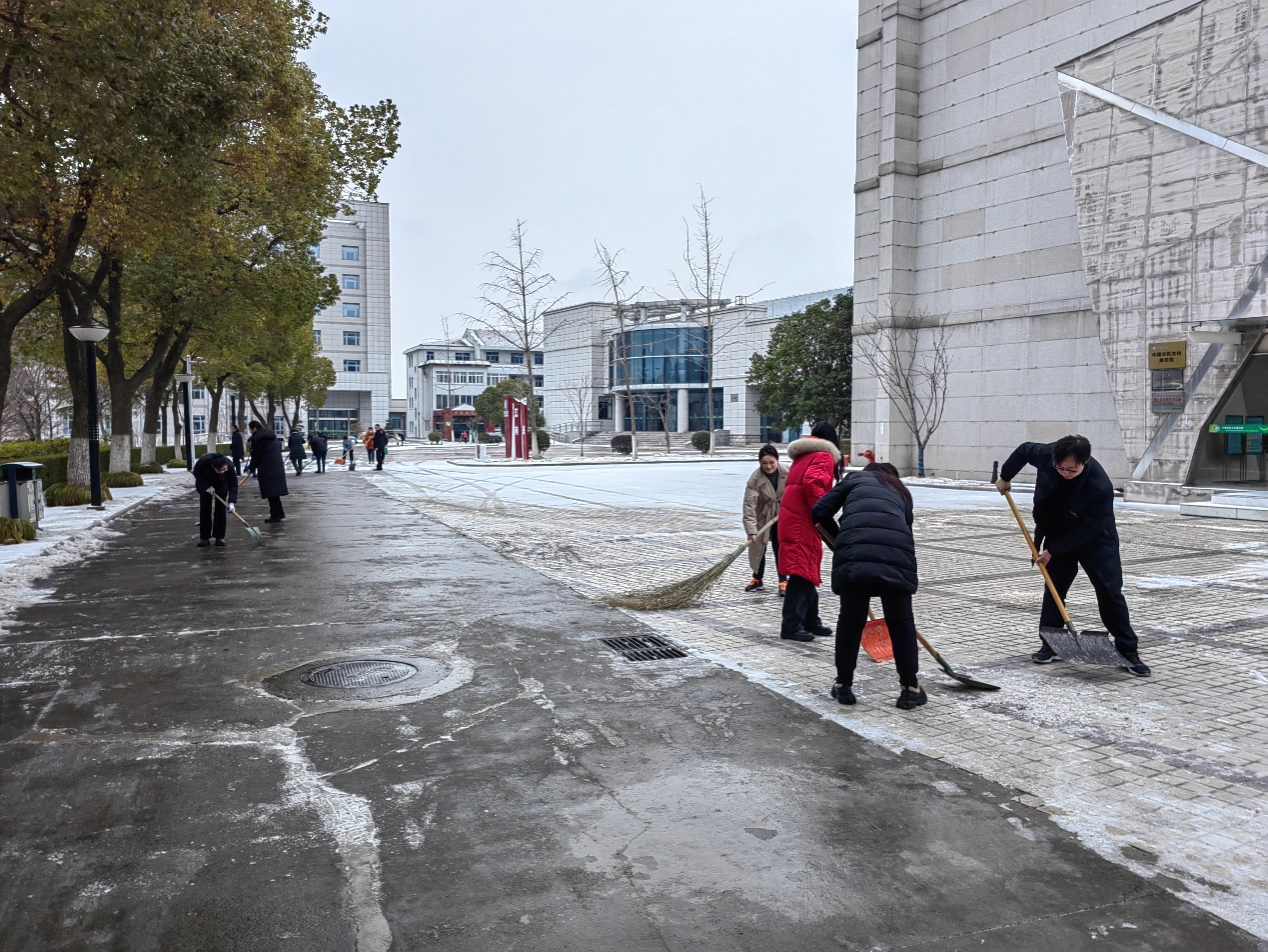 2月23日清晨,由后勤领导干部带头、党员志愿者和员工组成的铲雪除冰“铁军”不畏低温,手持除雪铲、铁锹、扫帚等工具积极投入到铲雪除冰工作中。