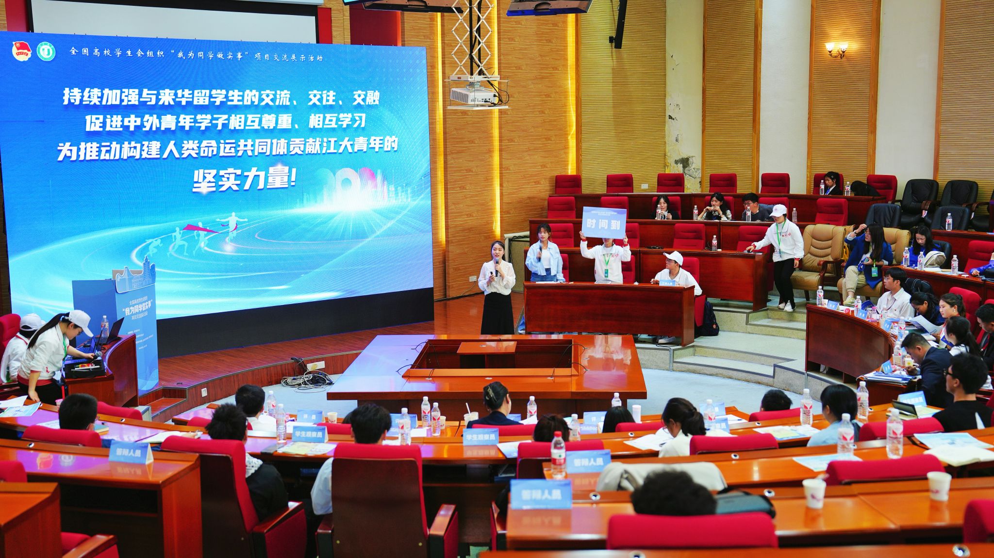 校研究生会主席团成员牧佳霖和医学院学生会主席团成员谷子昱,面向评委和学生观察员进行答辩;通过现场布展、知识宣讲、互动游戏、产品交流等环节,充分展示beat365官网学生会组织“我为同学做实事”项目积极向上的青春风采。在“敢想敢为大讨论”学联学生骨干沙龙、全国学联和升级学联专题联学活动中,2位项目团队成员认真聆听专题讲座,与全国高校学生会组织骨干们互相交流学习。