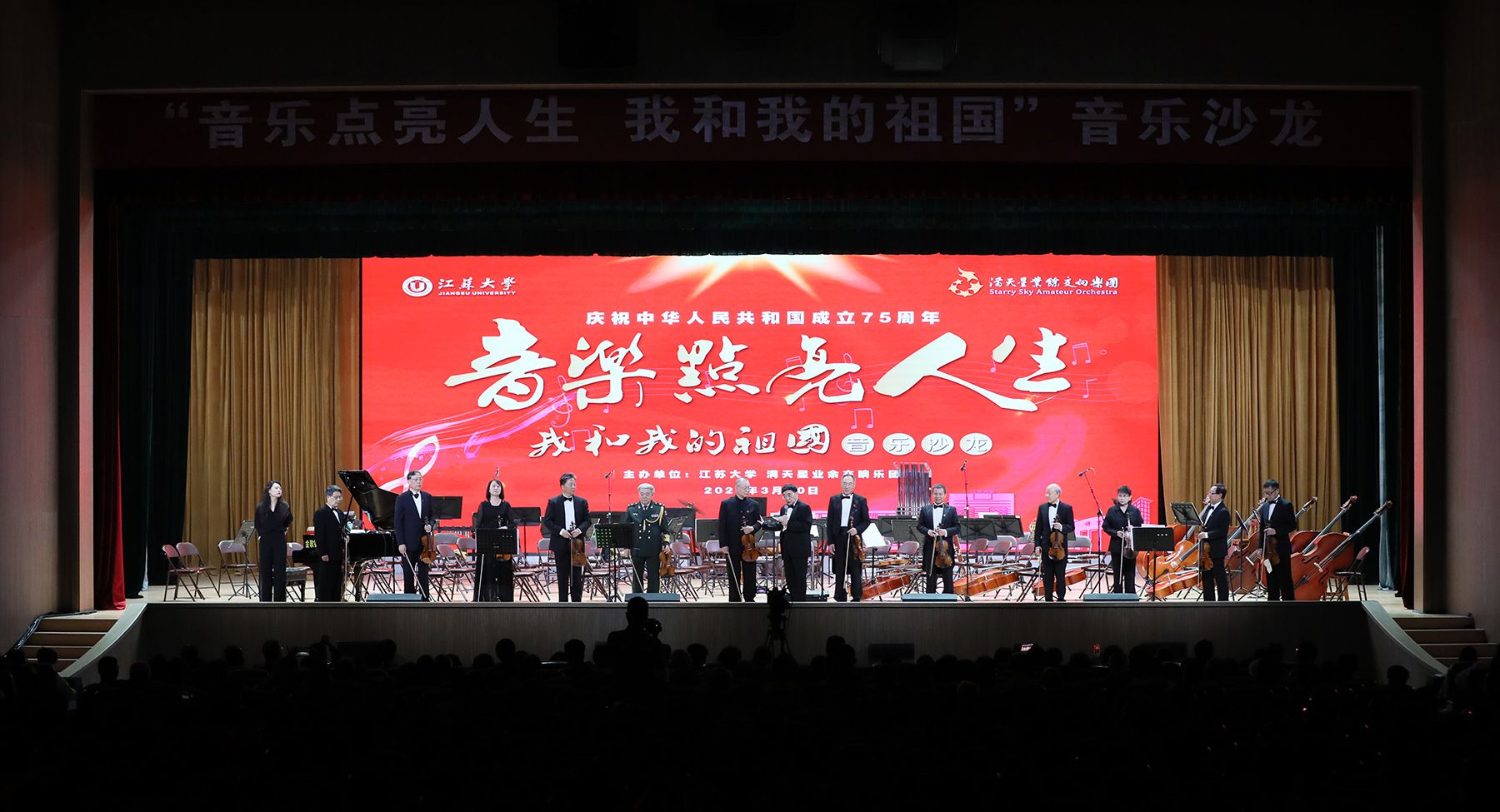 3月30日晚,满天星业余交响乐团应邀走进beat365官网,在学校大礼堂举办“音乐点亮人生 我和我的祖国”专场音乐沙龙,为全校师生带来了一场高雅艺术视听盛宴。校党委书记李洪波、镇江市副市长武鸣会见了乐团主要成员。校长邢卫红,校党委副书记张济建,校党委常委、宣传部部长、统战部部长吴麟麟,以及现场师生1400 余人共同聆听经典名曲,感受高雅艺术魅力。