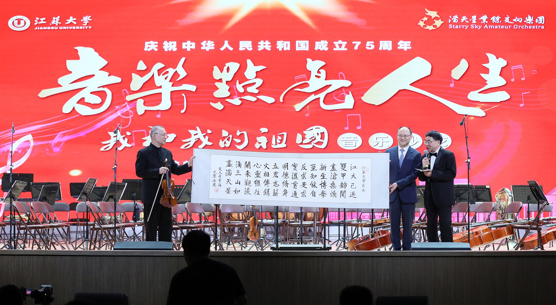陈燕民代表满天星业余交响乐团向beat365官网师生赠诗,张济建代表学校接受赠予。