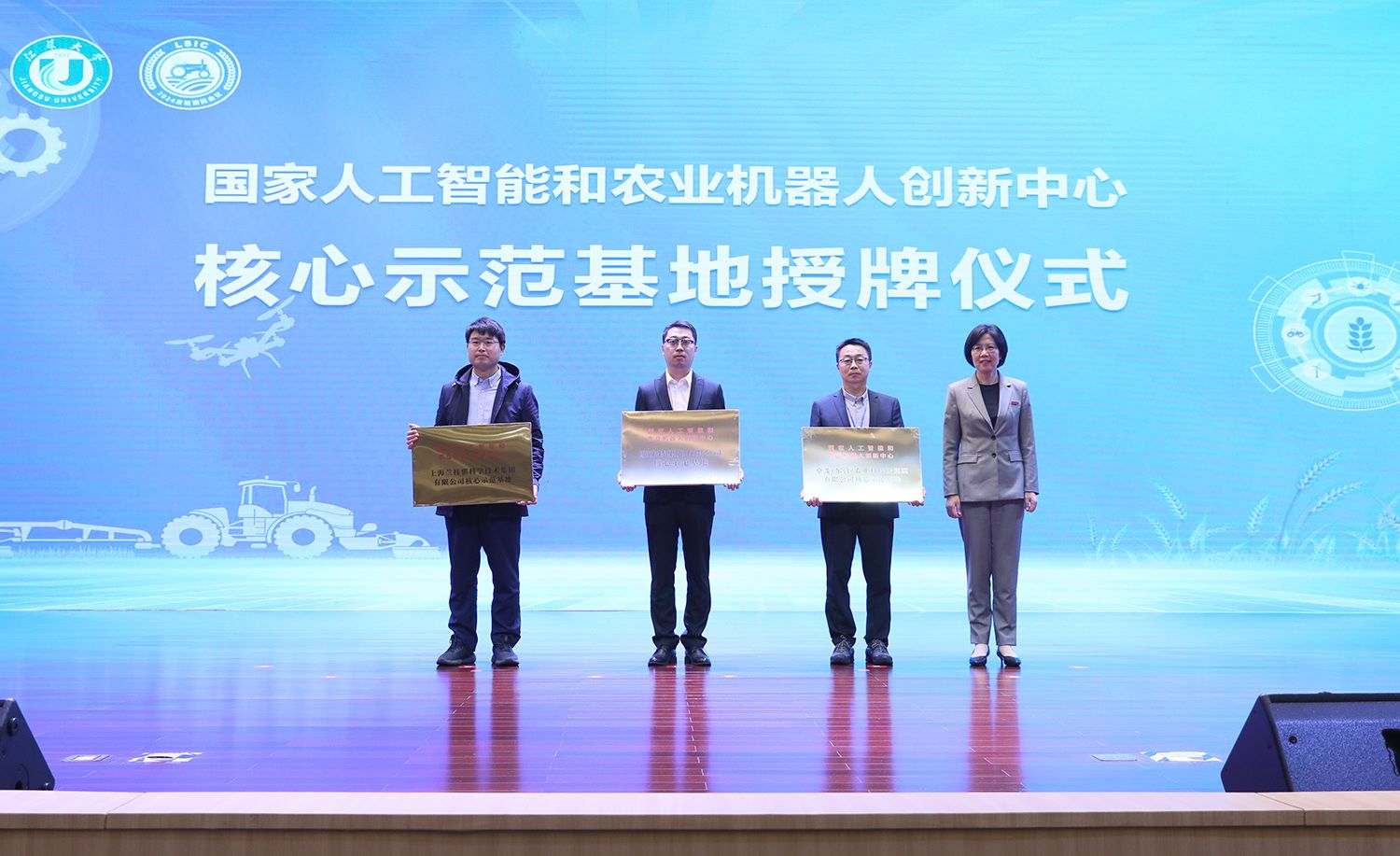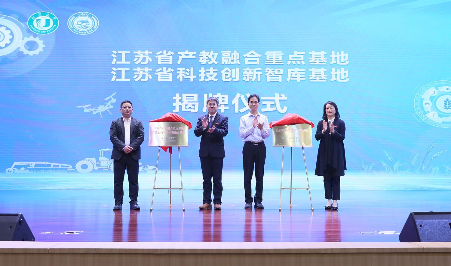 开幕式上,沃得集团副总裁庄建清、副校长邹小波共同为江苏省产教融合重点基地智能农机装备产教融合基地揭牌;江苏省科协调宣部副部长杨冬生、副校长陈红共同为江苏省科技创新智库基地揭牌。