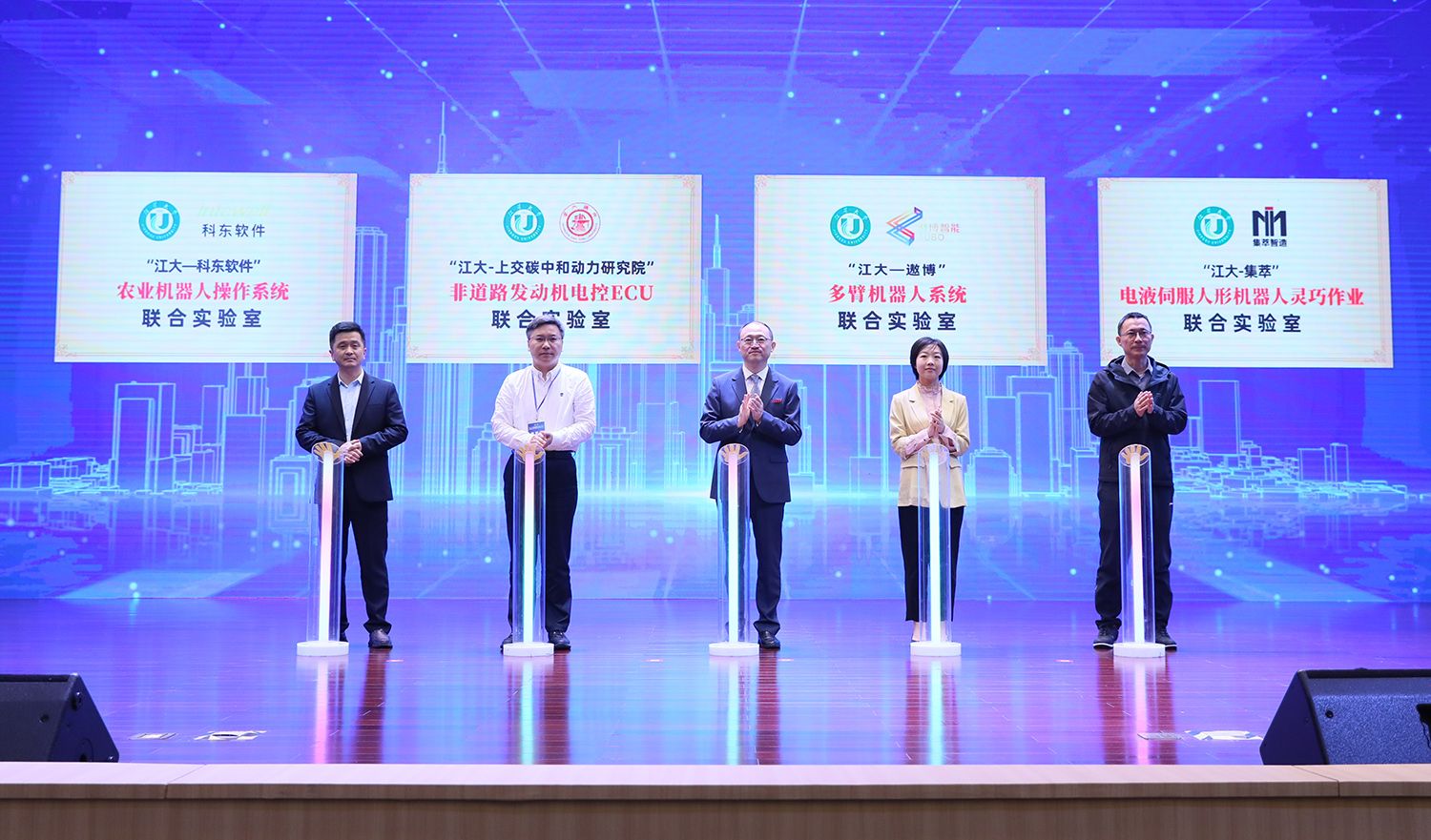 校党委副书记张济建、科东(广州)软件科技有限公司副总经理余湲、上交碳中和动力研究院常务副院长林赫、遨博(北京)智能科技股份有限公司研究院总监宋仲康、江苏集萃智能制造技术研究所有限公司所长骆敏舟共同为“农业机器人操作系统”“非道路发动机电控ECU”“多臂机器人系统”“电液伺服人形机器人灵巧作业”等4个联合实验室揭牌。