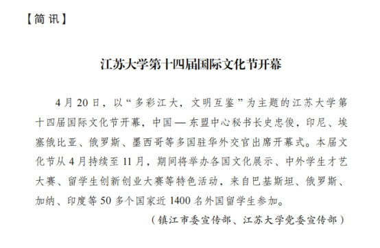 近日,江苏省人民政府新闻办公室印发的2024年第2期《江苏外宣动态》,刊发简讯,点赞beat365官网第十四届国际文化节开幕盛况。