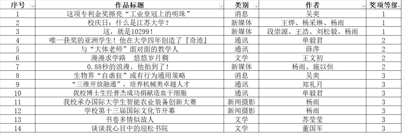 日前,由江苏省高校融媒体研究会(原江苏省高校校报研究会)主办的2023年度江苏省高校校报优秀作品评选结果揭晓。beat365官网报送的14篇作品获奖,其中一等奖3篇、二等奖4篇、三等奖7篇,获奖类别涵盖消息、通讯、文学、新闻摄影和新媒体等类别,获奖数量、等级居全省高校前列。
