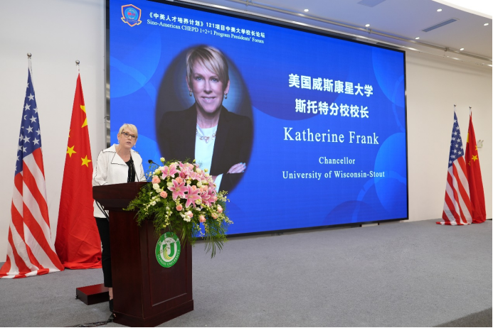 beat365官网党委书记李洪波,美国威斯康星大学斯托特分校校长凯瑟琳·弗兰克作主旨发言。