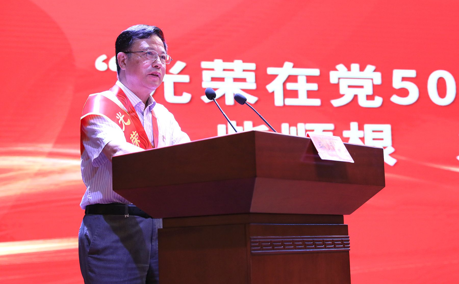 在“光荣在党50年”纪念章颁发仪式上,李洪波为到场的10位老党员顾子良、乔忠荣、胡昌龄、柴顺根、姜树李、程燮忠、王学芬、罗新民、闫述、张燎明颁发“光荣在党50年”纪念章并合影留念,10名新党员代表向老党员献花致敬。