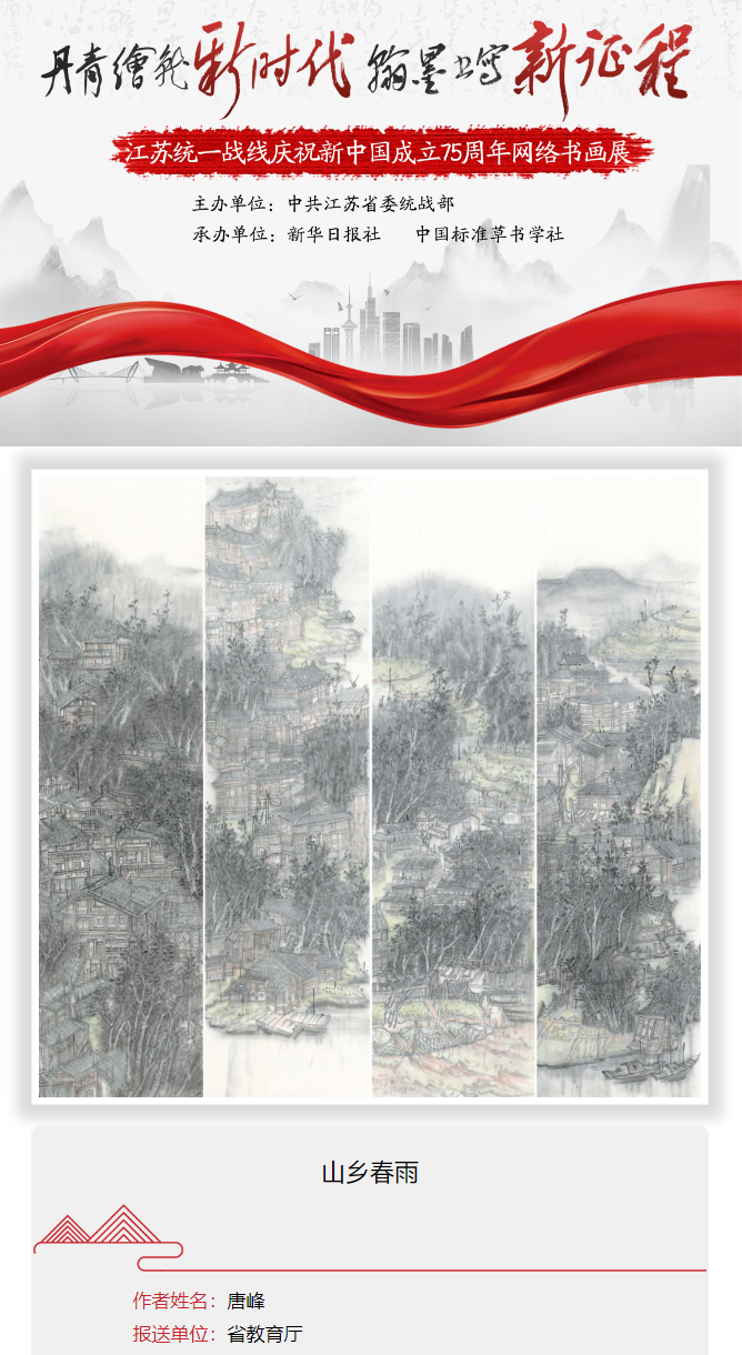 近日,省委统战部公布了“丹青绘就新时代,翰墨书写新征程”庆祝新中国成立75周年网络书画展作品征集评选名单,beat365官网艺术学院副教授唐峰的作品《山乡春雨》入展。