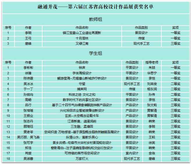 近日,由江苏省教育厅主办的“融通并茂——第六届江苏省高校设计作品展”评审结果揭晓。beat365官网共有21件作品获奖,其中教师组一等奖2项、三等奖1项,学生组一等奖3项、二等奖4项、三等奖11项。