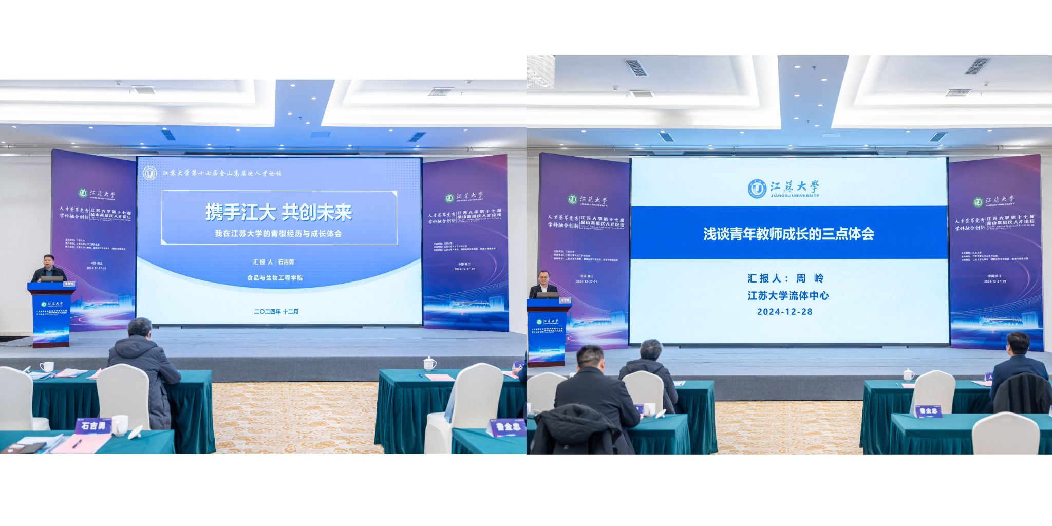 国家级青年人才、食品与生物工程学院副院长石吉勇作《携手江大 共创未来》主题报告。国家级青年人才、流体机械工程技术研究中心教授周岭作《浅谈青年教师成长的三点体会》主题报告,分享了自身成长路径和科研经历,为参会嘉宾起到示范作用。