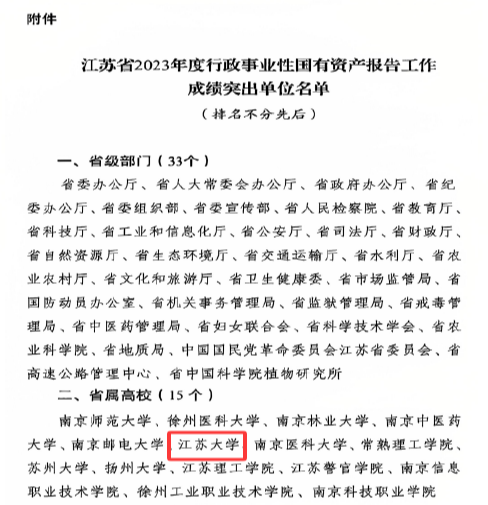 近日,江苏省财政厅发文反馈江苏省2023年度行政事业性国有资产报告工作情况,并对成绩突出单位进行通报表扬。全省共有15所省属高校受到表扬,beat365官网名列其中,这也是学校连续两年获得该项荣誉。