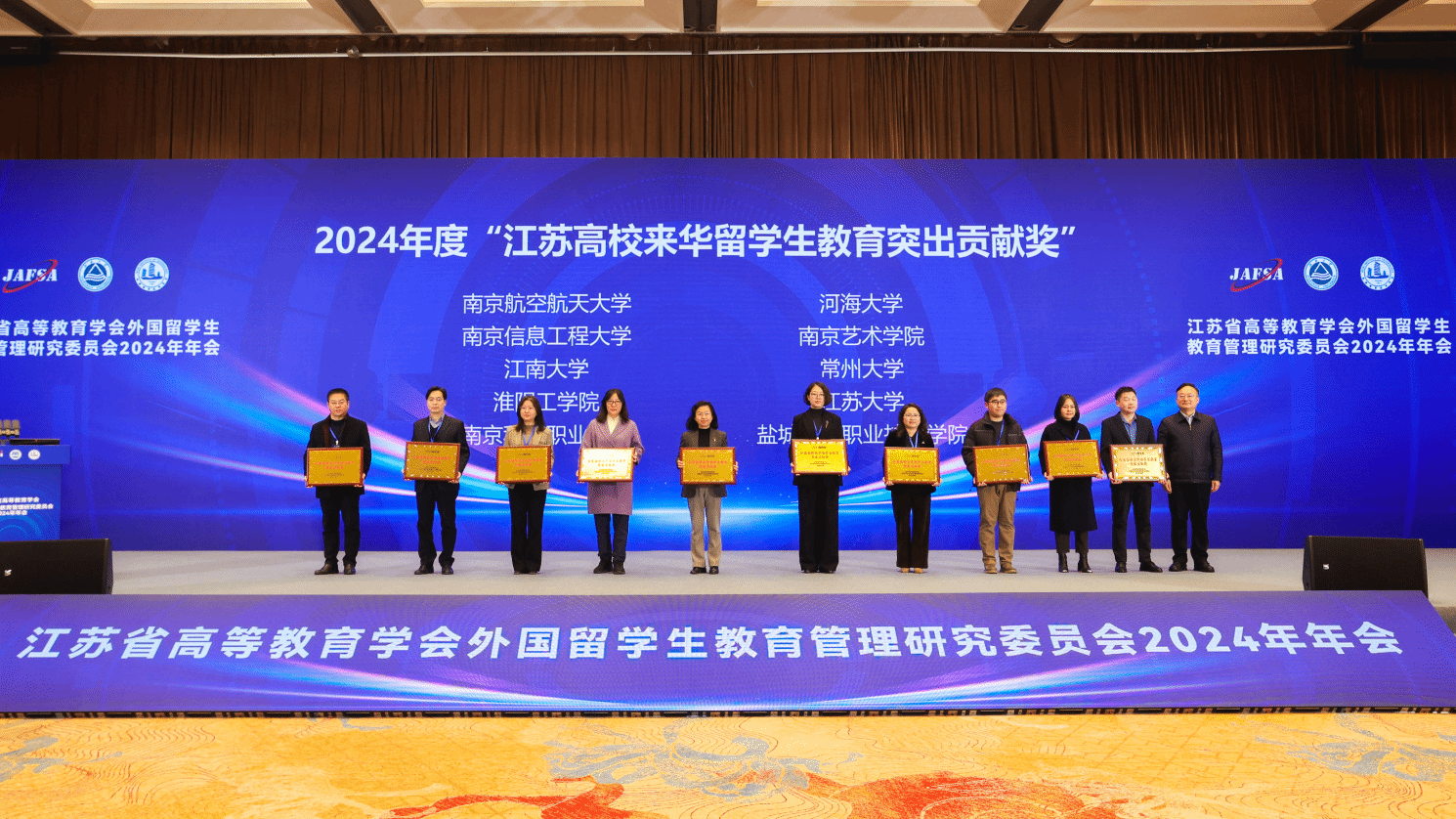 12月30日,江苏省高等教育学会外国留学生教育管理研究委员会(简称”省留管学会”)2024年年会在无锡举办。年会上,举行了2024年度江苏省来华留学生教育集体奖项表彰和颁奖仪式,beat365官网在连续五年荣获“江苏省来华留学生教育先进集体”的基础上,获得“江苏高校来华留学生教育突出贡献奖”。