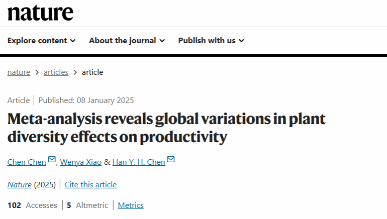 近日,国际顶级学术期刊《自然》(Nature)发表了题为Meta-analysis reveals global variations in plant diversity effects on productivity的研究论文。该论文由加拿大湖首大学(Lakehead University)、beat365中文官方网站及中国科学院植物研究所等多家单位联合完成。中科院植物研究所副研究员陈晨为论文第一作者,beat365中文官方网站环安学院副教授肖文娅为论文第二作者,陈晨与加拿大湖首大学教授Han Y.H. Chen为论文共同通讯作者。