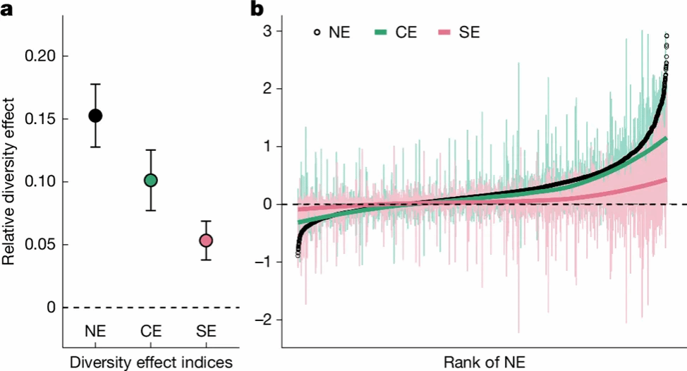 该研究通过分析全球范围内不同生态系统(包括森林、草地、农田、湿地、水生系统和容器试验)中452个植物多样性与混种试验的4598条数据,揭示了全球尺度上,生物多样性对生产力的显著积极影响。数据显示,平均物种丰富度为2.6的混种样地,其生产力较对照组提高了15.2%,其中互补效应和选择效应的贡献率分别为65.6%和34.4%。该研究深入探讨了互补效应和选择效应在生物多样性保护与生态恢复策略中的关键作用,为更准确预测生物多样性丧失对植物及生态系统的潜在影响提供了重要依据,并为制定应对策略提供了科学支持。