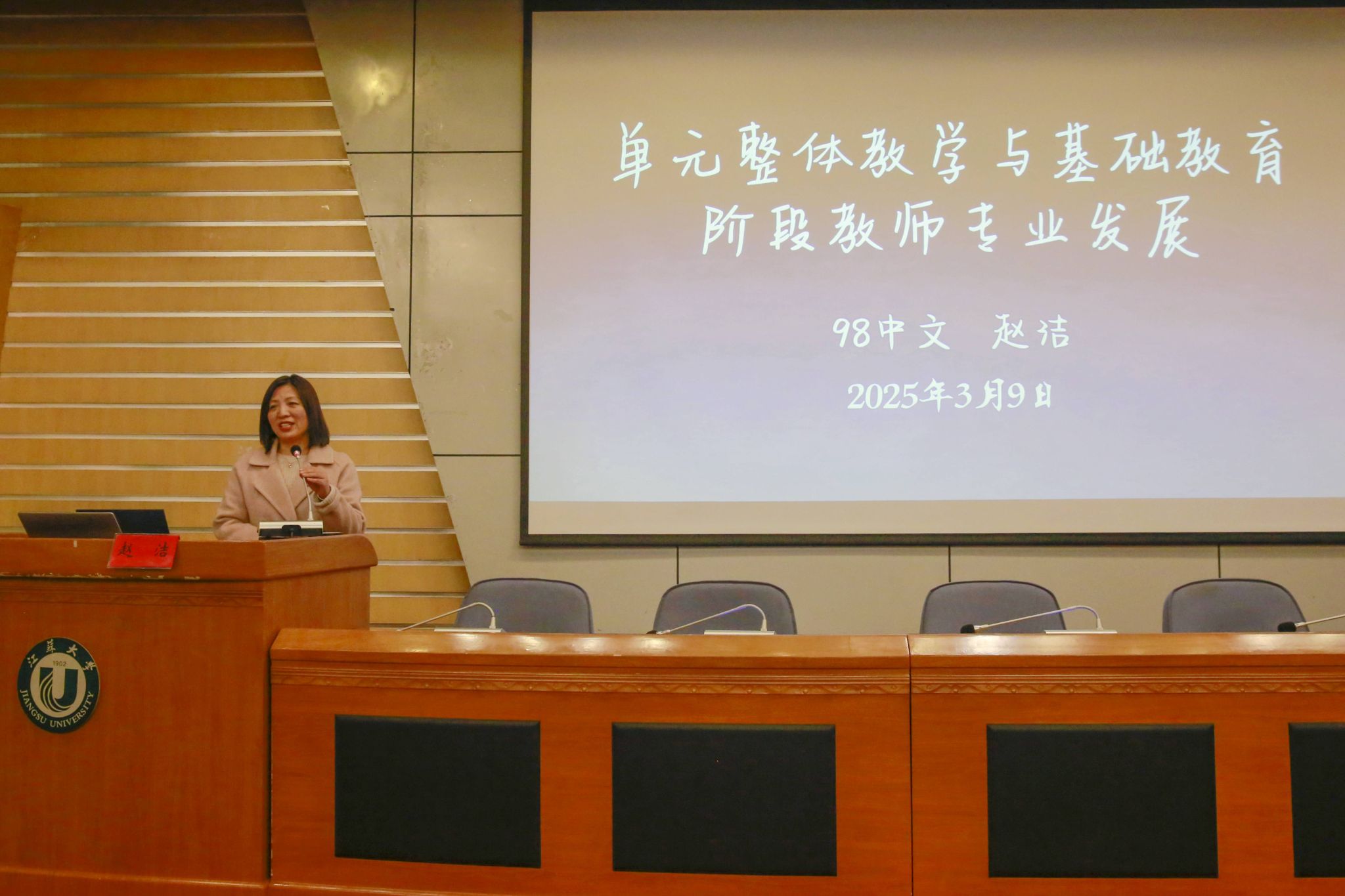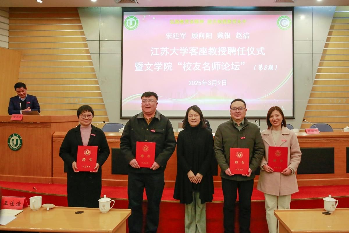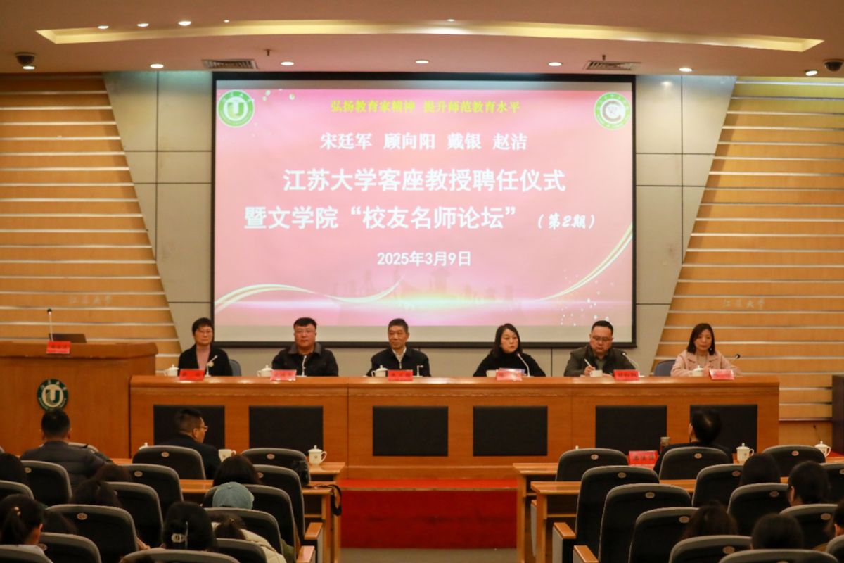 3月9日,beat365中文官方网站客座教授聘任仪式暨文学院“校友名师论坛”(第二期)在会议中心第一报告厅举行。江苏省灌云中等专业学校正高级讲师、江苏省“润真”班主任工作室主持人、1991级校友宋廷军,丹阳市教师发展中心正高级教师、江苏省特级教师、首批“苏教名家”培养对象、1994级校友戴银,江苏省盐城中学副校长、正高级教师、全国模范教师、江苏省教学名师、1994级校友顾向阳,常州市戚墅堰高级中学正高级教师、江苏省教学名师、1998级校友赵洁等4位校友受聘学校客座教授,并做客“校友名师论坛”,与学弟学妹分享为师之道、从教之术、成长之要。