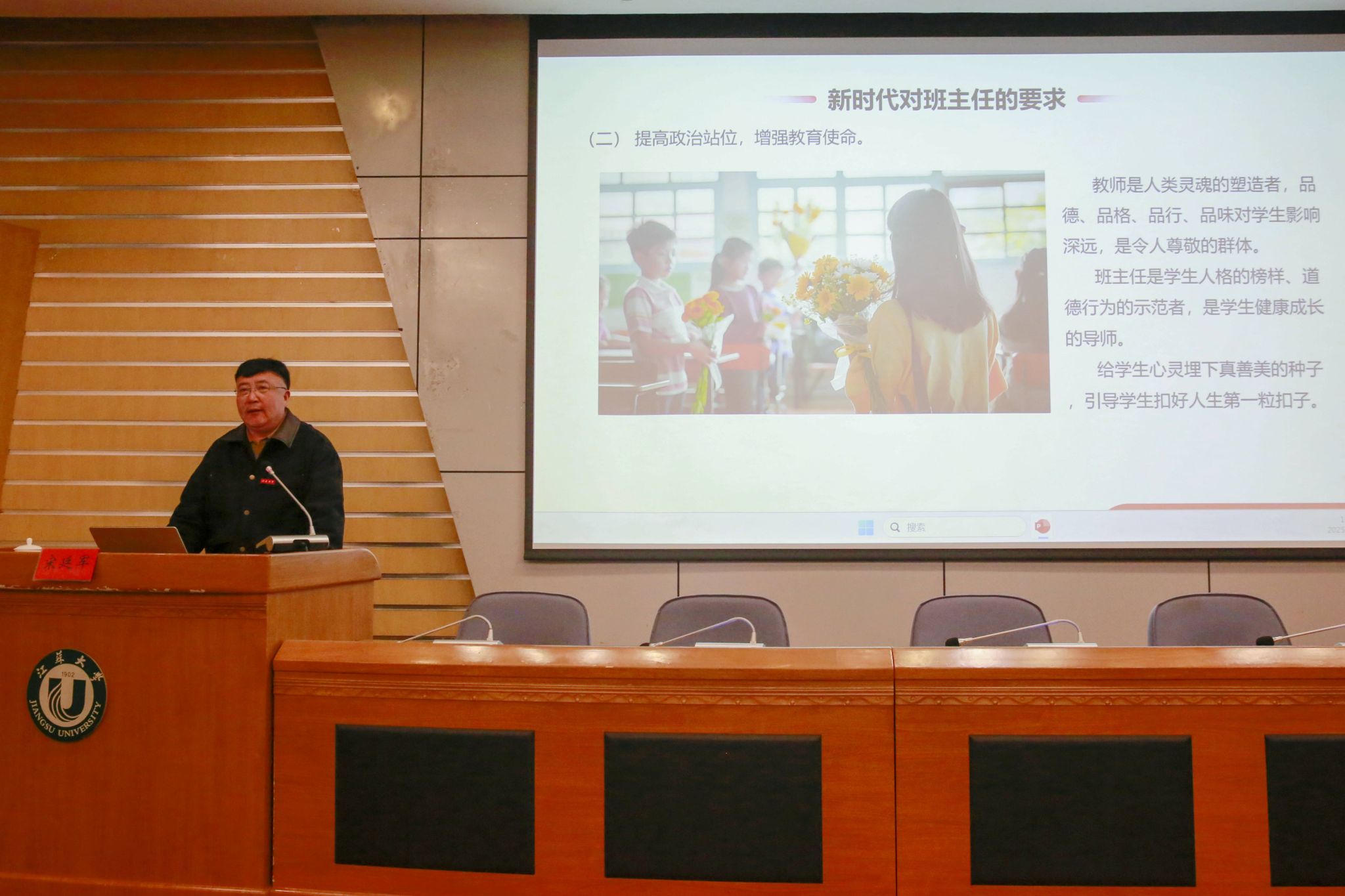 陈红代表学校致辞,向宋廷军、戴银、顾向阳、赵洁等4位中学(中专)正高级教师(讲师)校友颁发客座教授聘书,并为他们佩戴beat365中文官方网站校徽。致辞中,陈红简要介绍了学校发展状况、办学特色,回顾了师范教育的办学历史以及取得的成绩。陈红表示,4位校友名师受聘beat365中文官方网站客座教授,不仅是文学院师范教育师资队伍的发展壮大,也是文学院发扬优良传统、提升师范教育水平的重要举措,希望双方进一步加强沟通联系与交流合作,推动师范教育高质量发展。陈红要求,广大师范生要以优秀学长学姐为榜样,树立“躬耕教坛、强国有我”的志向和抱负,学好专业课,练好基本功,争做新时代“好老师”。