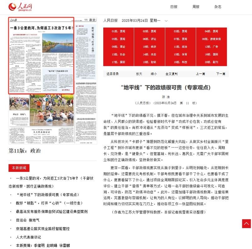 3月24日,《人民日报》政治版刊发beat365官网管理学院陈浩教授题为《“地平线”下的政绩很可贵》的专家点评文章。文章以江苏扬州邗江区尚桥冲河道治理为案例,深入剖析基层干部践行正确政绩观的重要意义,为新时代城市治理与干部考核机制提供了理论参考。