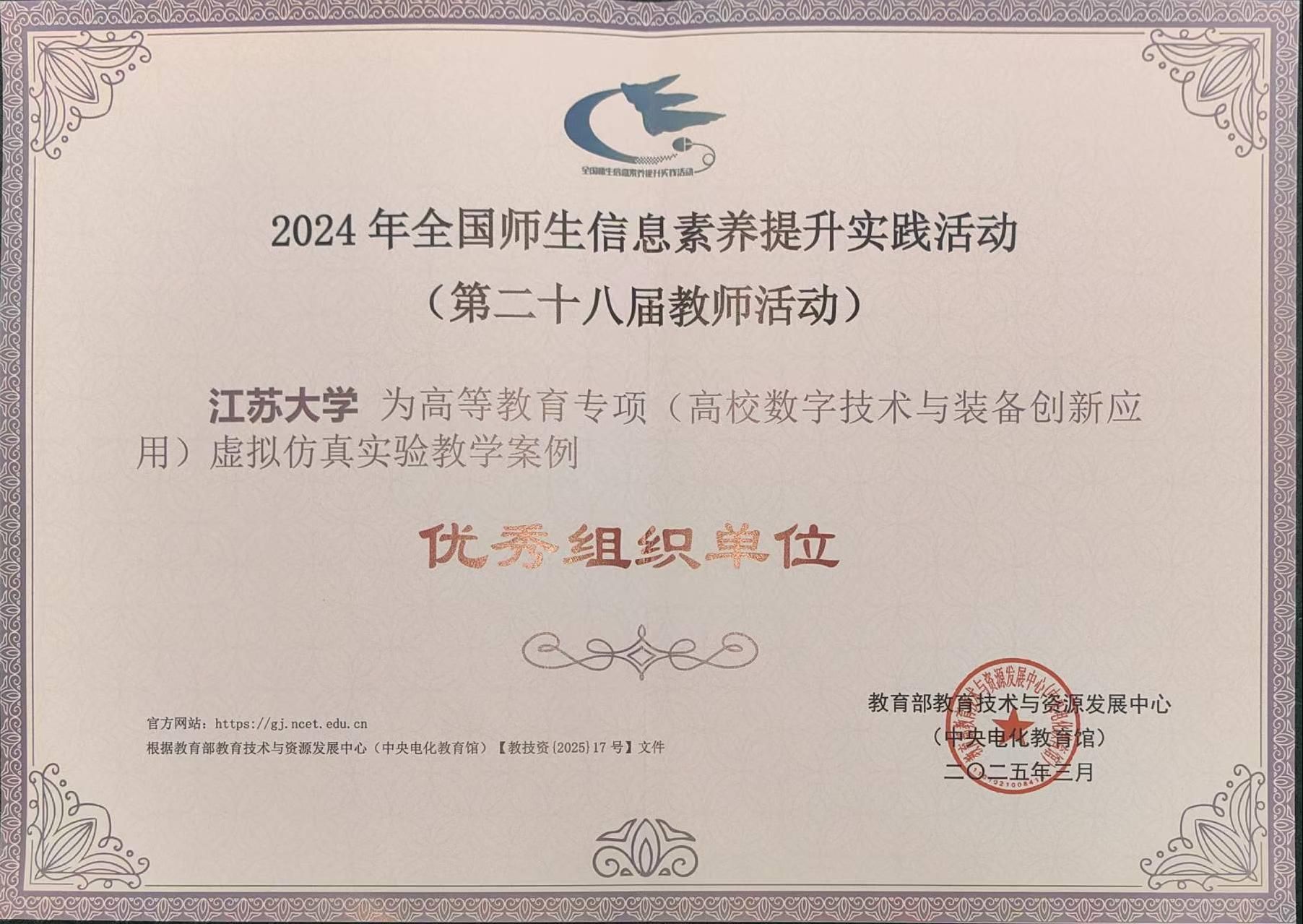 近日,在教育部教育技术与资源发展中心(中央电化教育馆)开展的2024年全国师生信息素养提升实践活动(第二十八届教师活动)中,“高等学校虚拟仿真教学创新实验室”项目2024年度案例征集评选结果正式揭晓。全国共有116项虚拟仿真实验教学案例获评高等教育专项典型作品,其中江苏省23项。beat365官网4个项目入选,学校获评“优秀组织单位”。
