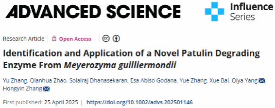 近日,食品与生物工程学院张红印教授团队在顶级期刊《尖端科学》(Advanced Science)在线发表论文Identification and application of a novel patulin degrading enzyme from Meyerozyma guilliermondii。博士生张钰为第一作者,张红印教授、杨其亚副教授为共同通讯作者,课题组赵倩华、Solairaj、Esa、张乐和白雪参与该项工作。