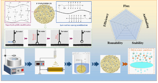该论文聚焦乳液分离过程中膜污染问题,创新性提出一种内外双修策略构筑一种双重抗污属性的功能化聚丙烯腈(PAN)纤维膜。内部改性通过在PAN膜的纤维网络中接枝两性离子聚合物,强化膜基质的水合能力,形成稳定的水合层和平衡膜表面电荷以抵抗油污染物的表面吸附,形成“污染物抵抗”功能;外部改性通过构建低表面能微区域,降低油污染物的水下粘附,赋予膜材料“污染物释放”特性,双重抗污属性协同作用强化膜材料的抗污能力。所制备的膜展现出优异的超亲水-水下超低油粘附的润湿特性,双重抗污特性进一步强化膜材料的抗污能力,显著提升膜材料的乳液分离效果(分离通量超过2000L·m⁻²·h⁻¹,分离效率高达99.1%)。