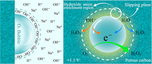 上图直观展示了O2气泡固定在多孔碳电极表面所形成的“气-液-固三相界面”上的离子分布与H2O2生成机制。在电极施加+1.1V电位下,气泡的双电荷层内形成富集的OH−区域,显著降低其氧化为羟基自由基(•OH)的能垒。随后,•OH可进一步偶联生成H2O2(红色箭头)。与此同时,H2O也可直接通过双电子氧化路径生成H2O2(蓝色箭头),该过程在气泡提供的疏水环境下避免了•OH过度氧化。此外,气泡周围的O2还能捕获前述反应释放的电子,通过化学还原途径生成H2O2(绿色箭头)。三种路径协同作用,实现了在无催化剂条件下对H2O2的绿色电合成。
