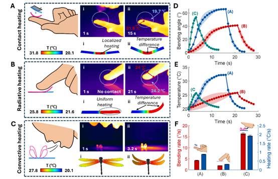 该研究创新性地提出了螺旋编程取向制备技术,通过两阶段巯基-丙烯酸酯迈克尔加成与光聚合反应,研制了预编程应变高达2500%的超拉伸液晶弹性体,超越了传统液晶弹性体的应变极限。特别值得关注的是,在此基础上制备的超拉伸液晶弹性体LCE-25驱动器展现出优异的低温驱动特性,极大降低了液晶弹性体驱动器所需的响应温度,可实现25-33℃驱动温度下16.75°/s的热形变。