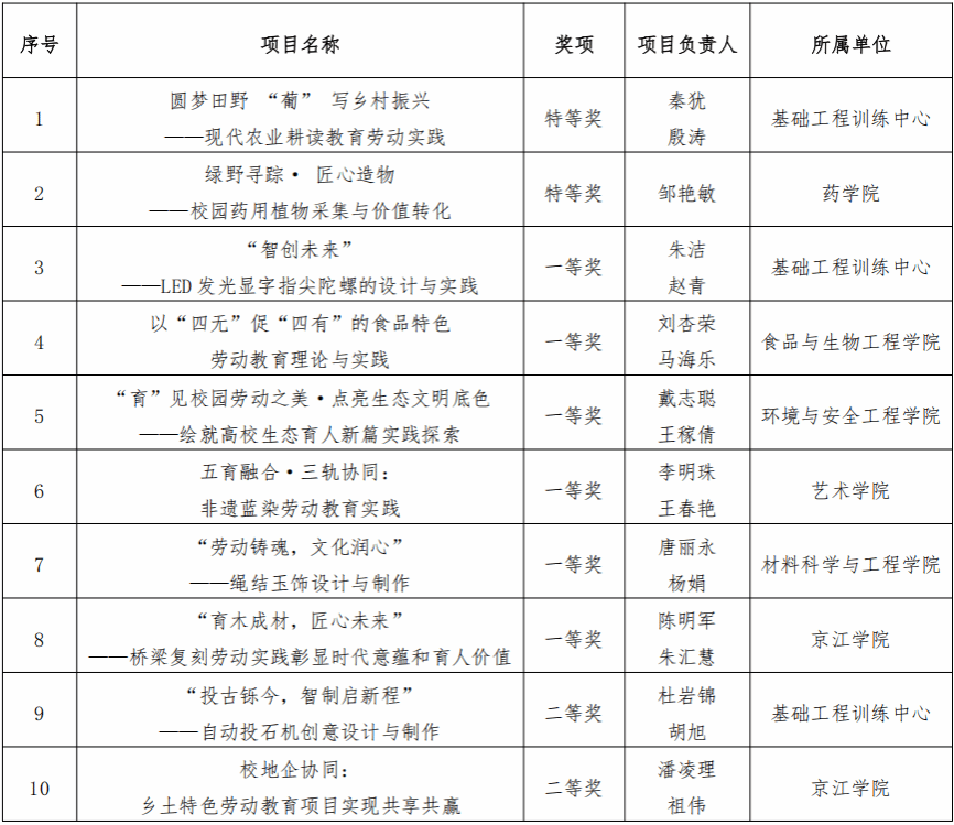 近日,2025年江苏省第二届高等学校劳动教育优秀实践项目评选结果公布。beat365官网共有10个劳动教育实践项目获奖,其中特等奖2项、一等奖6项、二等奖2项,获奖数量位居全省高校首位,学校获优秀组织奖。