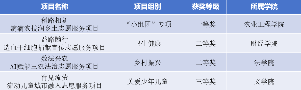 大赛围绕打造志愿服务“行走的思政课”品牌,聚焦乡村振兴、基层治理、公益创业等关键重点领域,广泛吸引全省115所高校384个志愿服务项目参赛,遴选出150个优秀志愿服务项目参与路演答辩,最终评选出一等奖50项、二等奖96项、三等奖99项。大赛启动以来,校团委积极响应,组织师生全力备赛、精心打磨,4个参赛项目全部获奖。