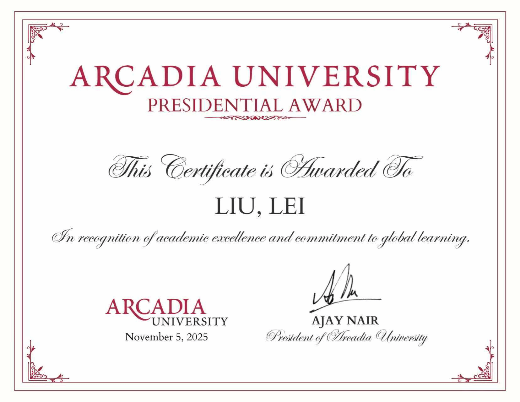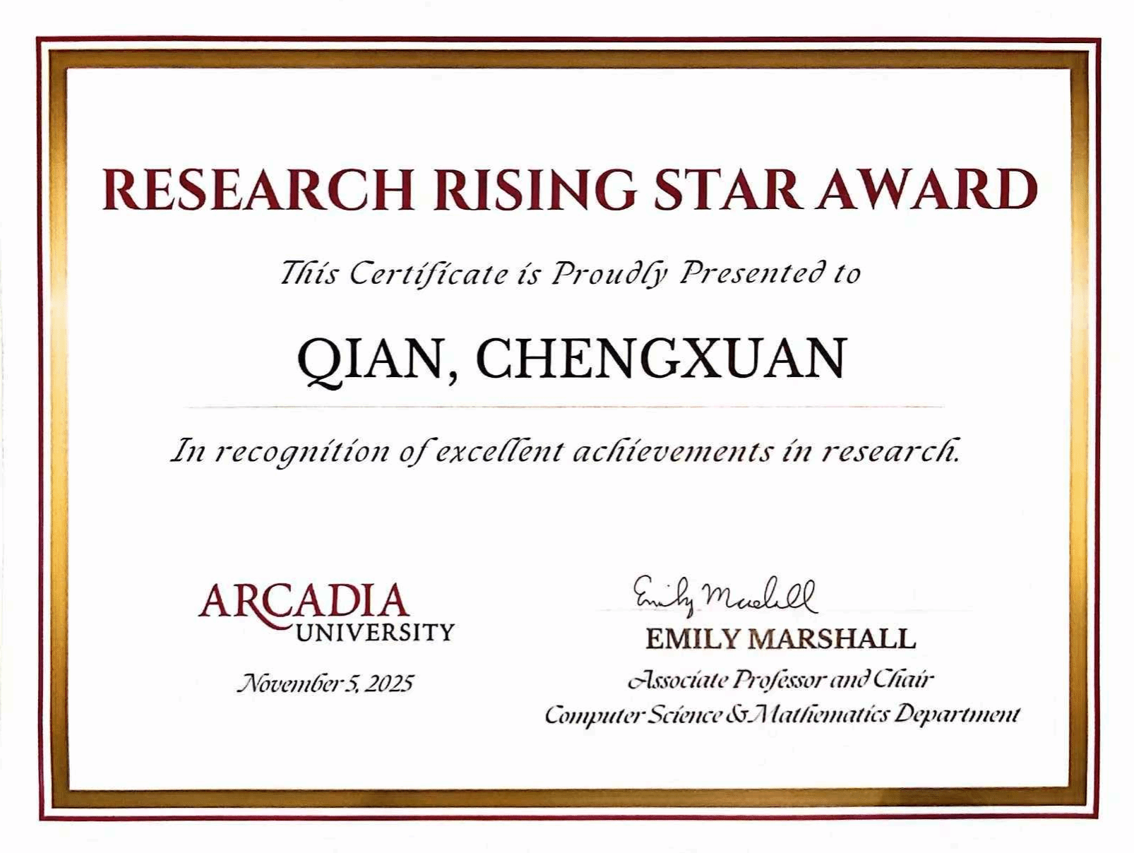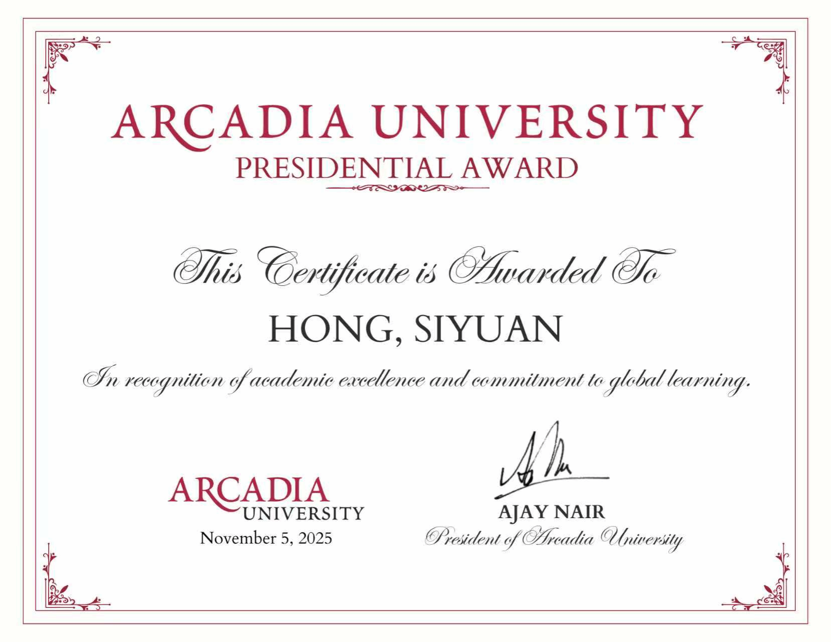 近日,beat365官网与美国阿卡迪亚大学合作的数学与应用数学(中外合作)项目学生洪思源、刘磊荣获阿卡迪亚大学最高荣誉“校长奖学金”,钱承炫获评“科研新星奖”。