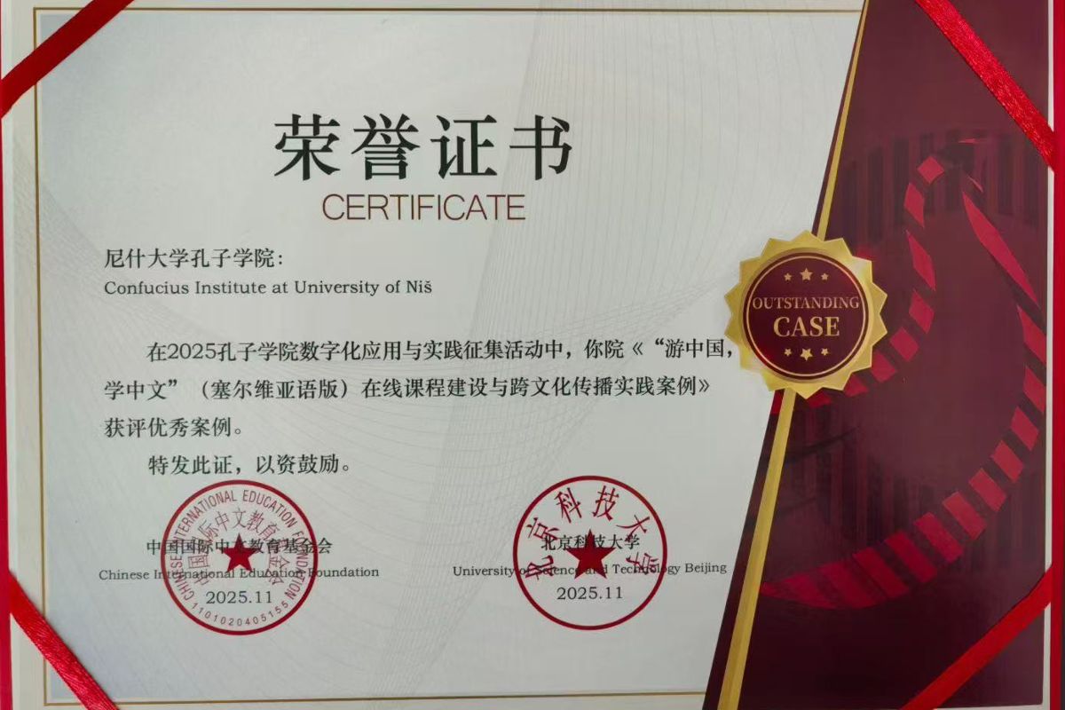 在同期举办的2025孔子学院数字化应用与实践案例征集活动中,外派至孔院的文学院教师罗立新负责的《“游中国 学中文”(塞尔维亚语版)在线课程建设与跨文化传播实践案例》,以及beat365官网国际中文教育专业毕业生、教师杨念提交的《从镜头中走来——短视频赋能国际中文教育的创新实践》,获评优秀案例,展现了孔院在数字化教学与跨文化传播方面的前沿探索与扎实成效。