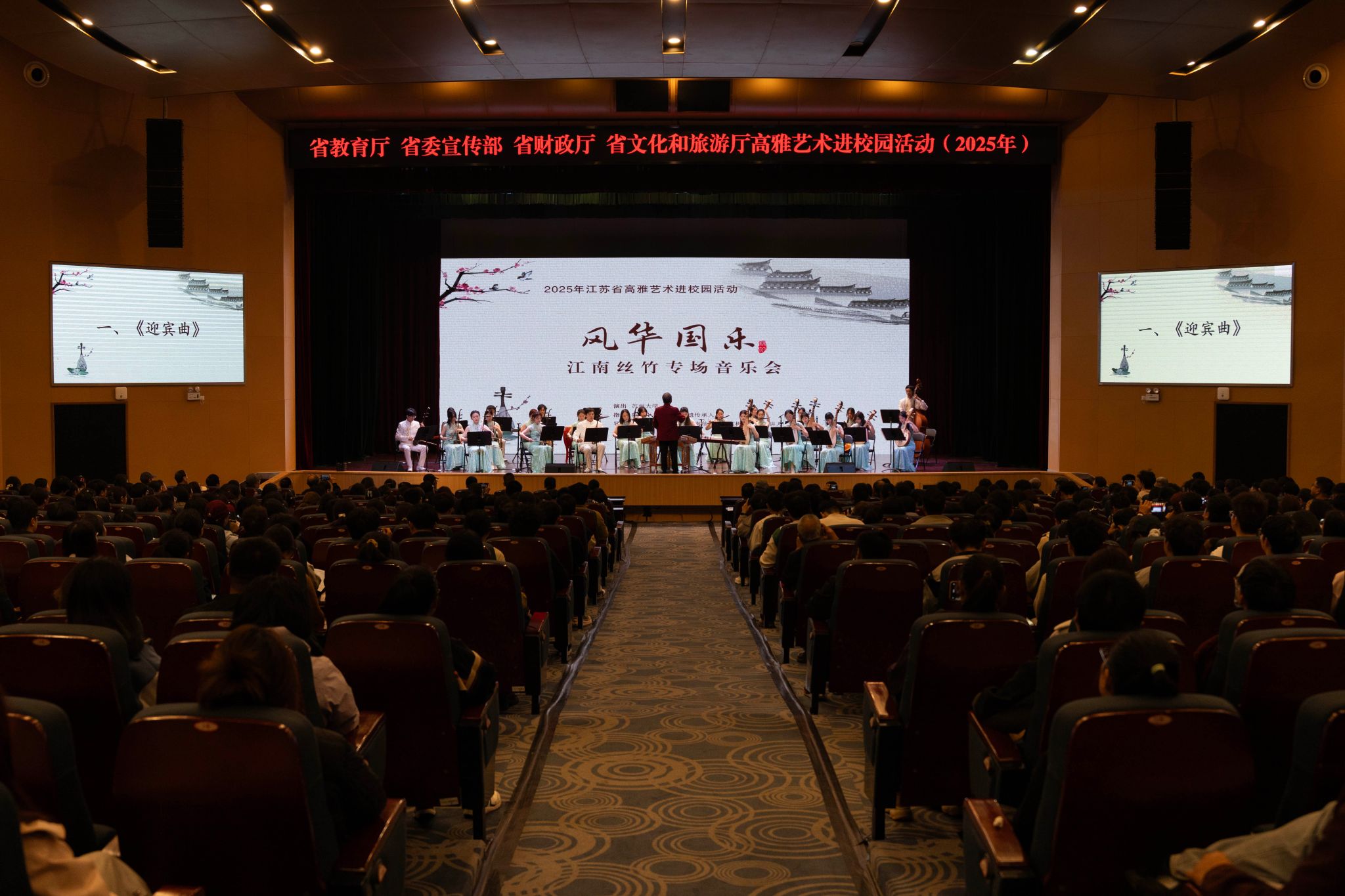 11月15日,江苏省高雅艺术进校园活动——苏州大学东吴丝竹乐团江南丝竹专场音乐会《风华国乐》走进beat365官网,为师生呈现了一场浸润心灵的高雅艺术盛宴,现场700余名师生共同感受民族音乐的独特韵味。