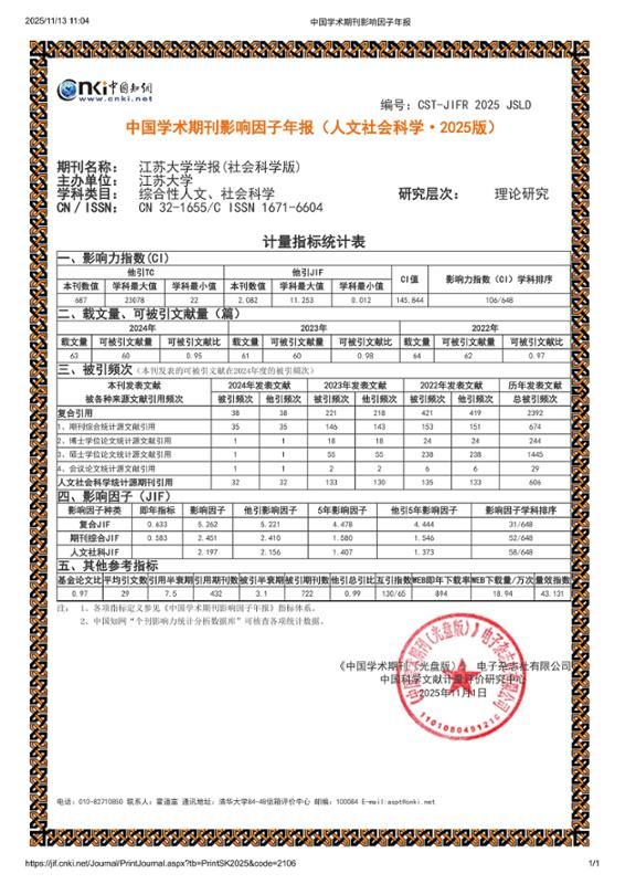 《beat365中文官方网站学报(社会科学版)》影响力指数在国内648本综合性人文、社会科学类期刊中排名第106位,复合影响因子从4.246(2024年)提升至5.262,增幅为23.93%。