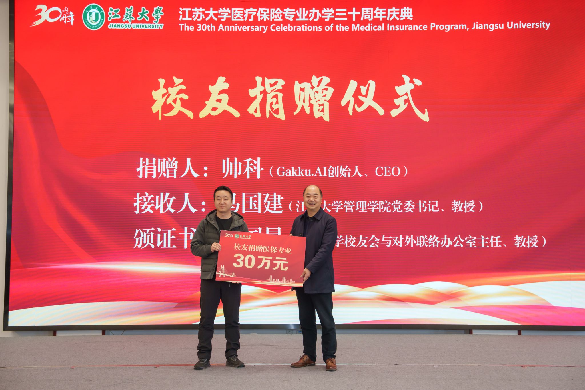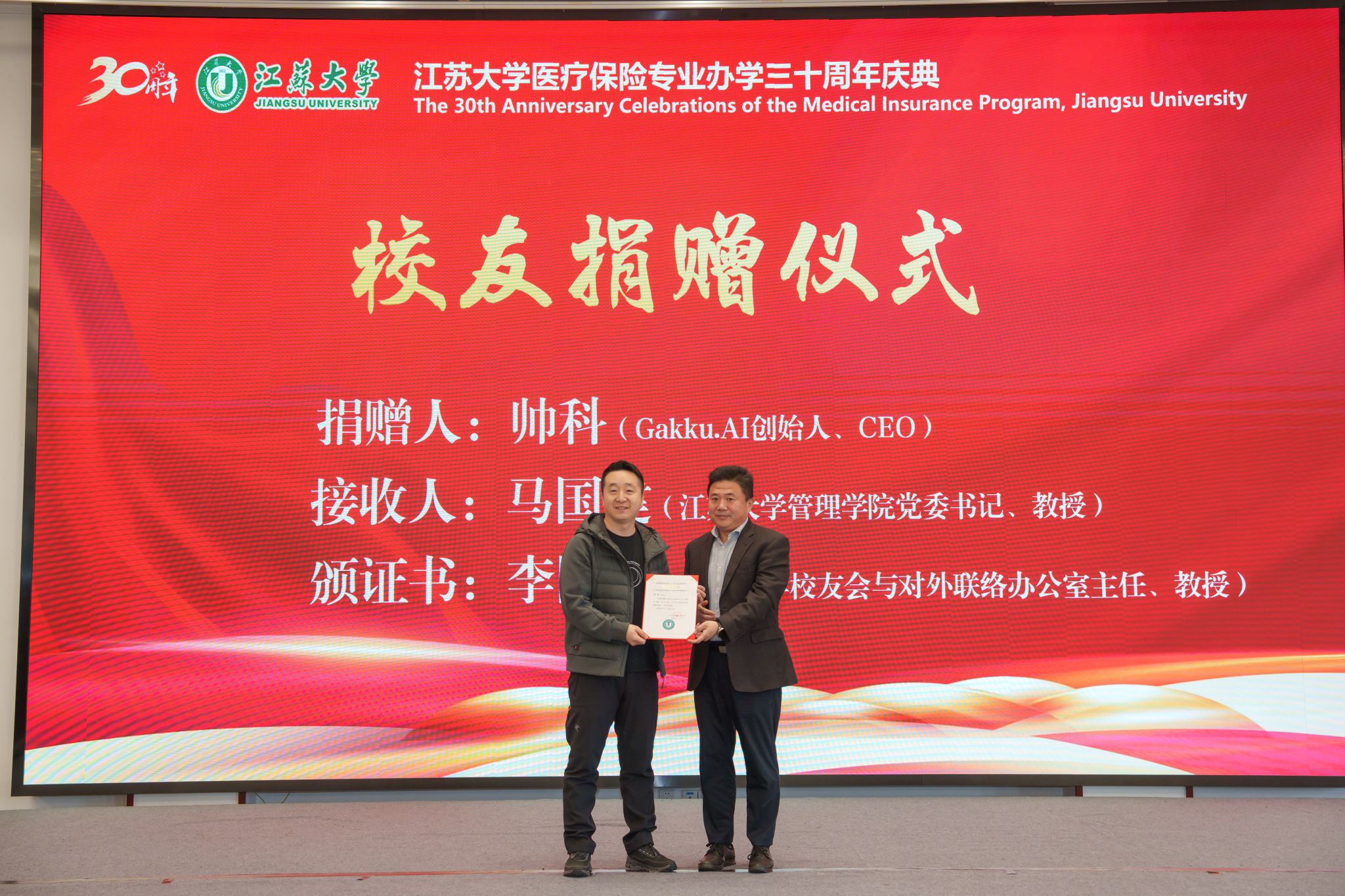 医保2002级校友、猿辅导在线教育公司联合创始人、Gakku.AI创始人兼CEO帅科向医保专业捐赠30万元,用于支持人才培养与专业建设。管理学院党委书记马国建代表学院接受捐赠,校友会与对外联络办公室主任李国昊向帅科颁发捐赠证书。