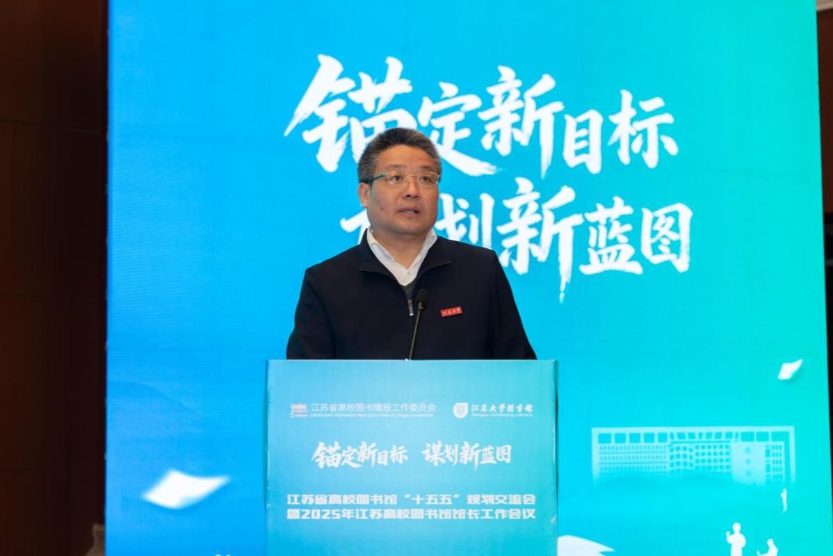 杨道建致辞,回顾了beat365官网办学历史,介绍了beat365官网图书馆发展取得的成绩,指出会议对擘画江苏高校图书馆“十五五”发展蓝图、推动深入交流的重要意义。