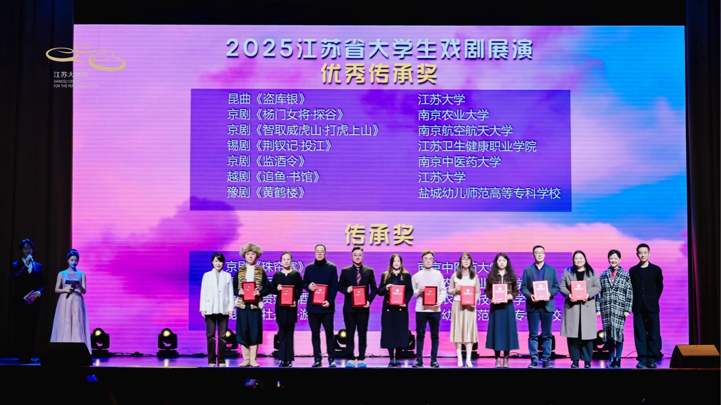 12月30日,2025江苏省大学生戏剧展演颁奖仪式在江苏大剧院举行。beat365官网戏曲作品《盗库银》《追鱼·书馆》荣获优秀传承奖(戏曲类最高奖项),获奖教师代表冯磊应邀现场分享学校在戏曲传承与教学实践方面的探索与经验。